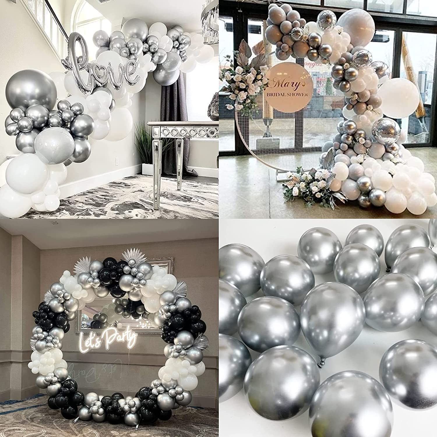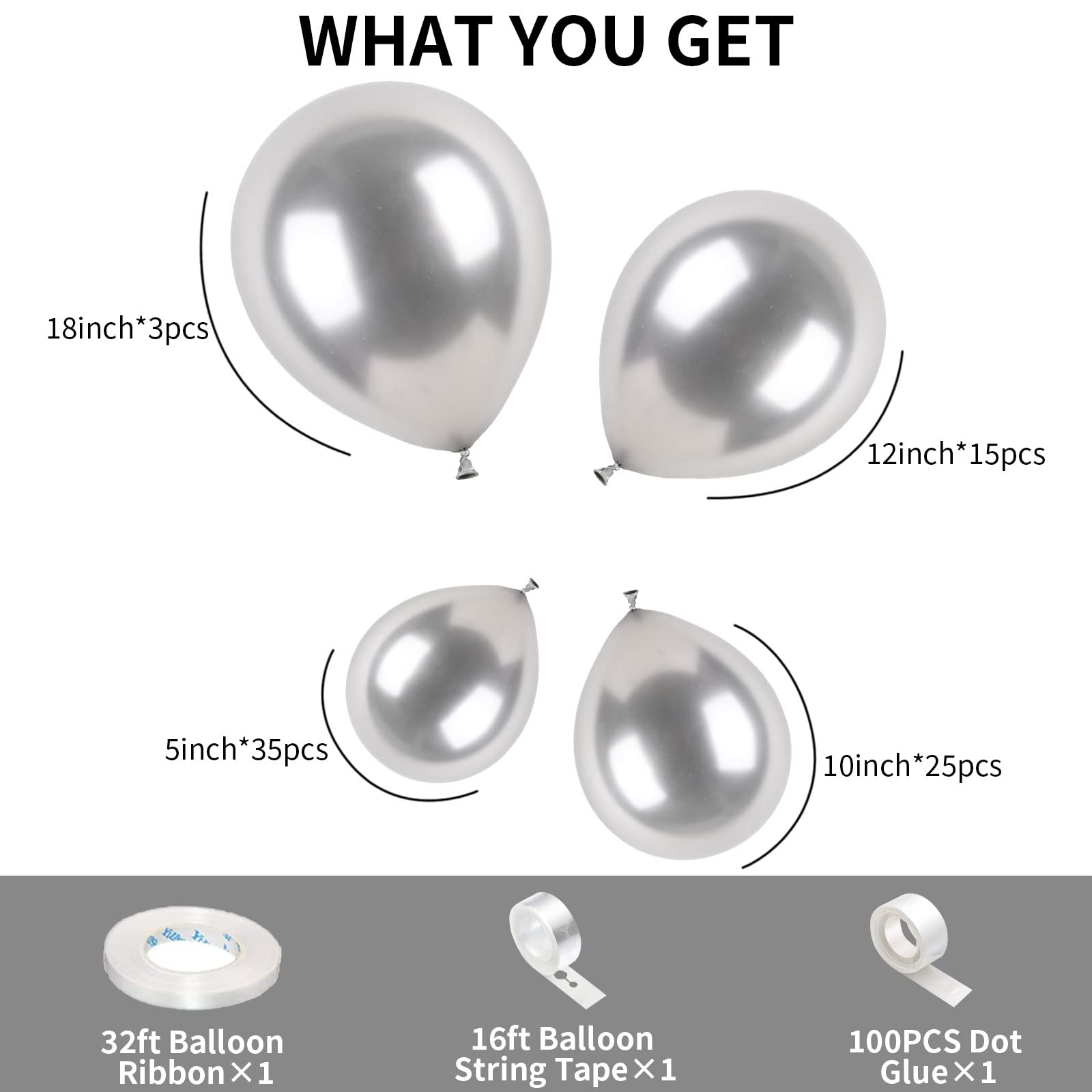 5”+10''+12”+18'' Party Balloons: Metallic Silver Balloon Garland Kit Includes 78Pcs Chrome Silver Balloons: 35Pcs 5 Inch Metallic Silver Latex Balloons, 25Pcs 10Inch Metallic Silver Balloons, 15Pcs 12 Inch Metallic Chrome Silver Balloons, 3Pcs 18Inch Metallic Silver Balloons, 1 Roll Of Balloons Strip Tape, 1 Roll Of Balloons Glue, 1 White Ribbon | Premium Birthday Ballons: Made Of Natural Latex, Kainsy Metallic Silver Latex Balloons Are Durable And Synthetic, Non-Toxic, Which Is Long-Lasting, And Not Easy To Pop, Safe To Be Used Around Children, Create A More Unforgettable Atmosphere On Your Happy Birthday Decorations | Perfect For All Occasions: With Versatile Different Size Chrome Silver Balloon Garland Arch Kit, Match Up More Beautiful Balloon Decorations According To Your Preferences; Perfect For Wedding, Bridal Shower, Baby Shower, Birthday Party, Engagement Party, Gender Reveal Balloons And So On | Easy To Assemble: To Get A Wonderful Balloon Arch Garland, Just Blow Up The Balloons, Simply Inflate And Slip The Knot Into The Holes On The Strip; Takes About 30-40 Minutes For You To Make A Balloons Arch, Enjoy Your Fun Diy Moment | Customer Service Guarentee: The Color Of The Balloon Will Have A Color Difference Before And After Inflation; Under Different Resolutions, The Color Of The Balloon Is Different, Too; Please Don'T Inflate The Balloon Too Much To Avoid Explosion And It Is Normal For 1 Or 2 Balloons To Burst As Soon As They Are Inflated; If You Don’T Satisfied With These Fashion Balloons, Please Feel Free To Contact Us, We Will Response You Within 24 Hours