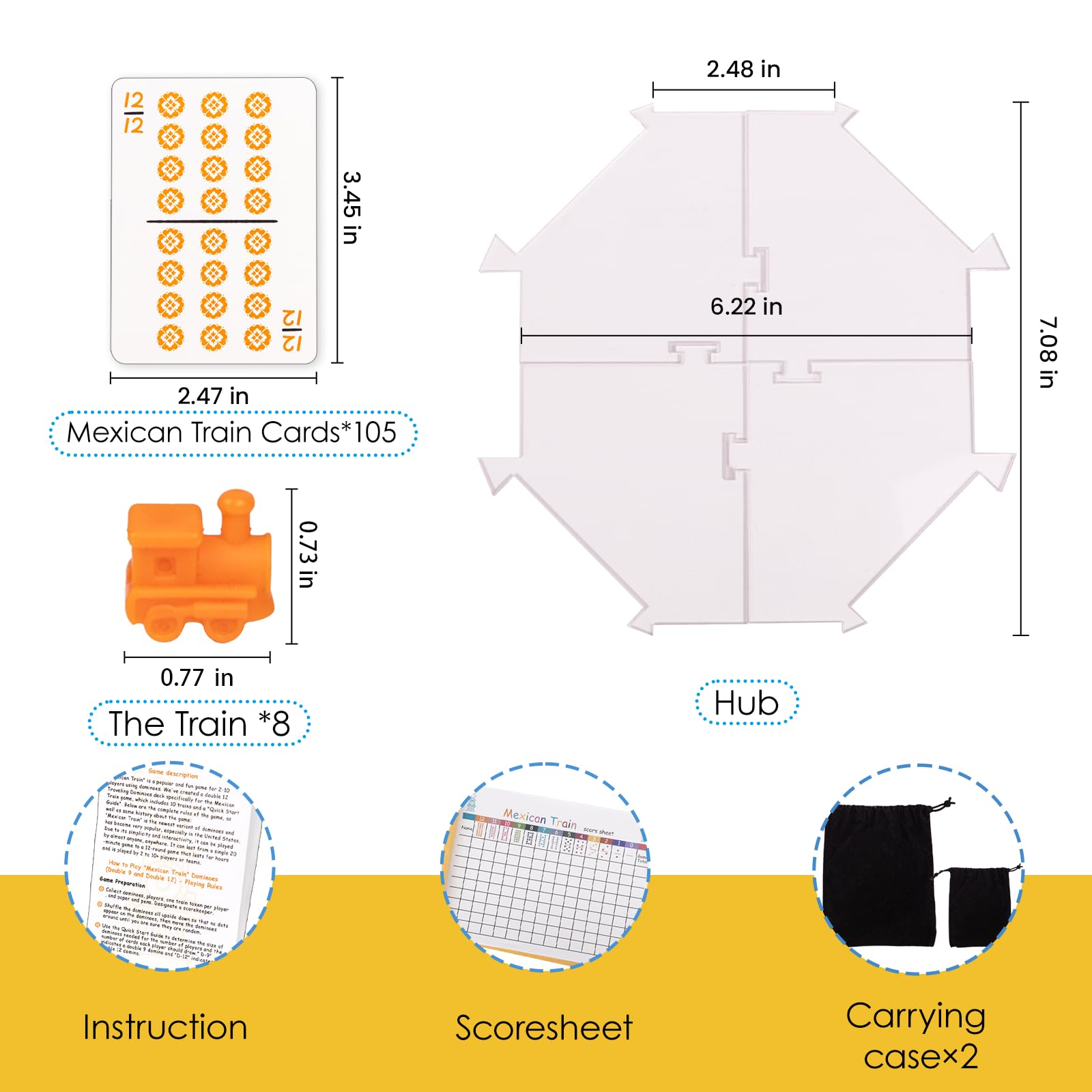 - Q: What is included in the Mexican Train Mini Travel Dominoes Game set? A: The Mexican Train Mini Travel Dominoes Game set includes 105 domino cards, 1 hub for Mexican Train, 8 train markers, 1 instruction manual, and 1 scoresheet. This complete set is designed for easy setup and quick gameplay.