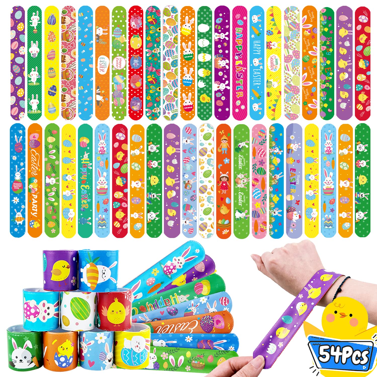 - Q: How many slap bracelets are included in the pack? A: Each pack contains 54 pieces of Easter slap bracelets, making them perfect for group activities, parties, or as fun Easter basket stuffers.