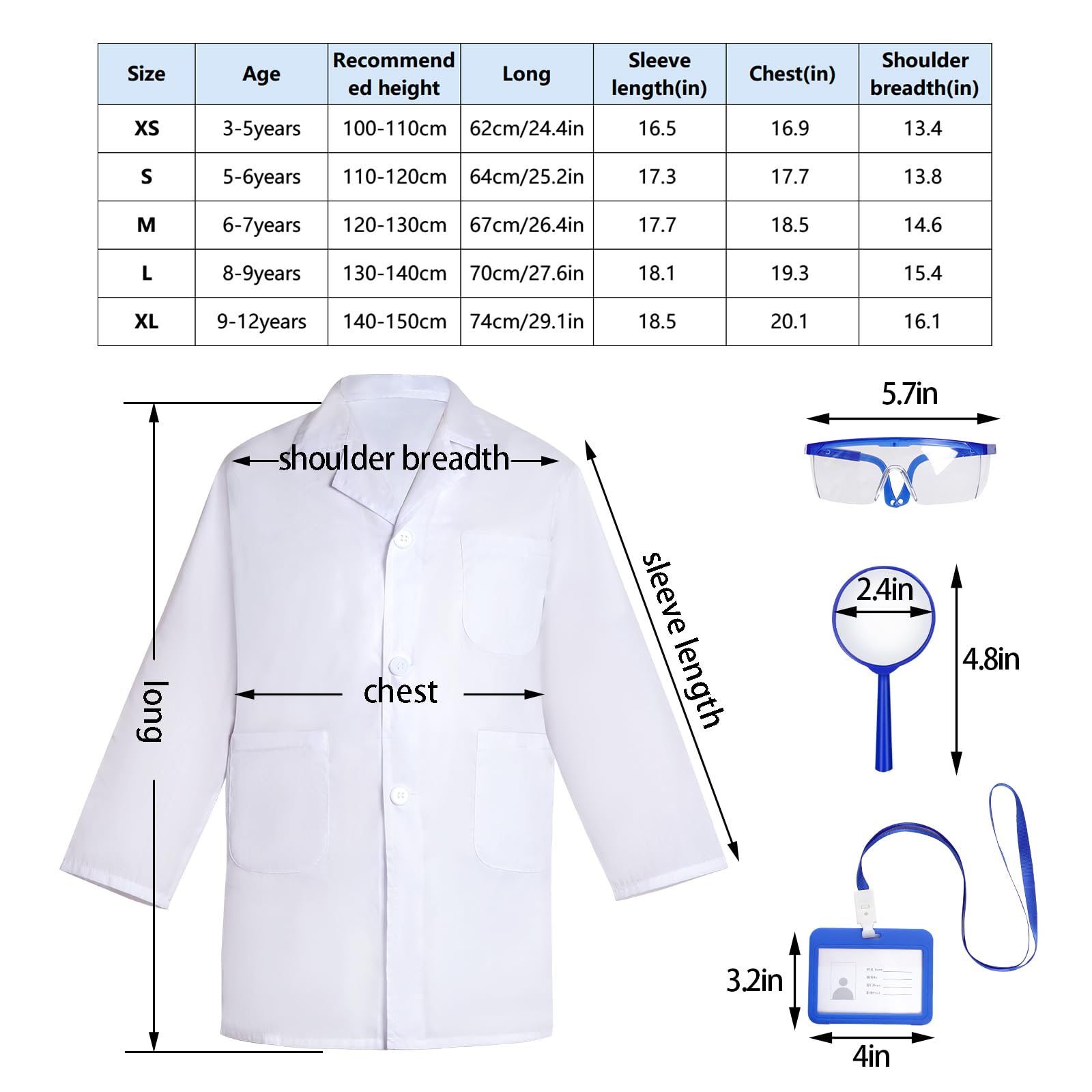 View compareMifengda Doctor Scientist Costume Kids Lab Coat And Goggles Children Dress Up Kit With Id Card Magnifying Glass For Halloween (Small, Blue)