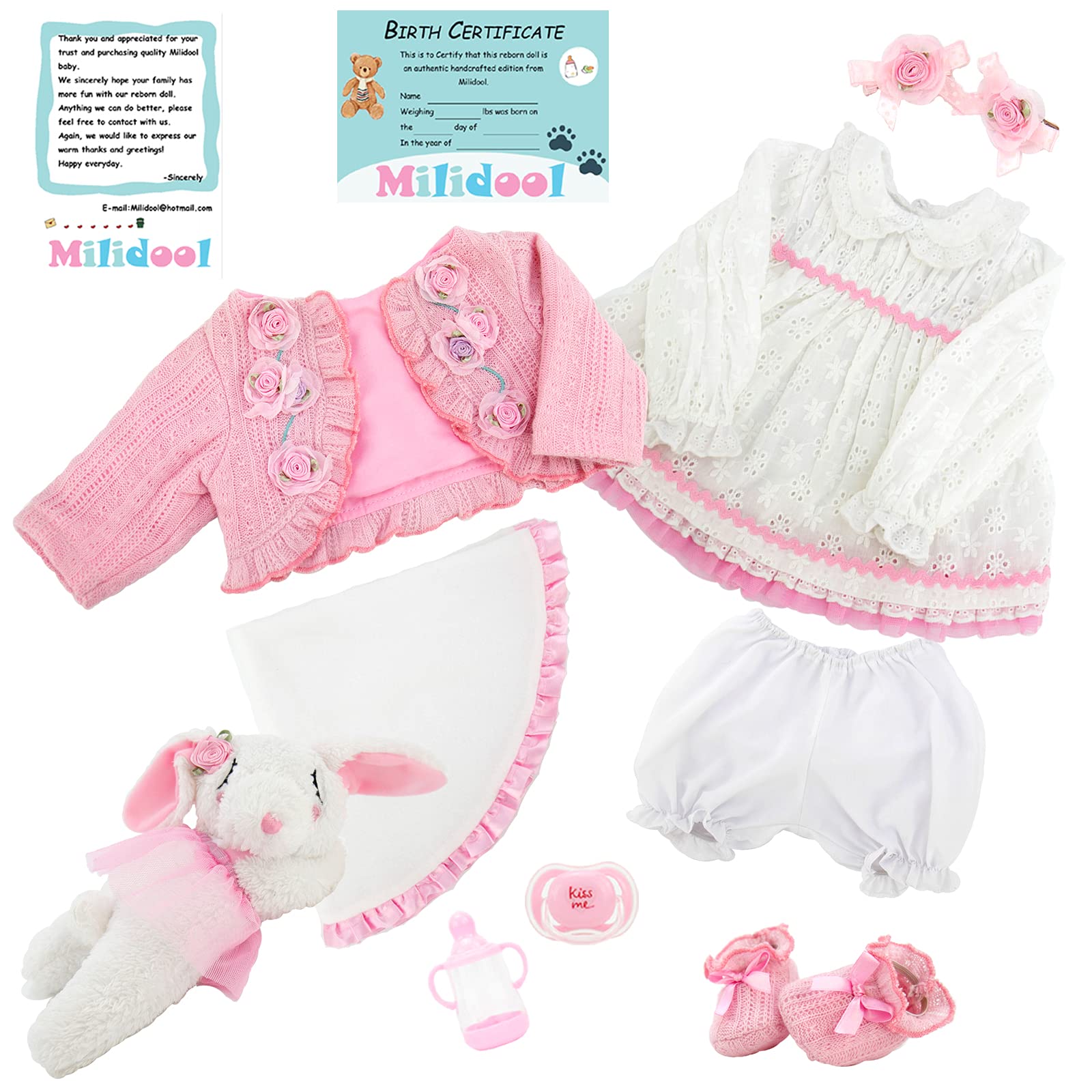- Q: Does the doll come with any accessories? A: Yes, the Milidool Reborn Baby Doll comes packaged with a variety of accessories including a cuddly plush bunny, a feeding bottle, a magnetic pacifier, and a birth certificate, enhancing the play experience.