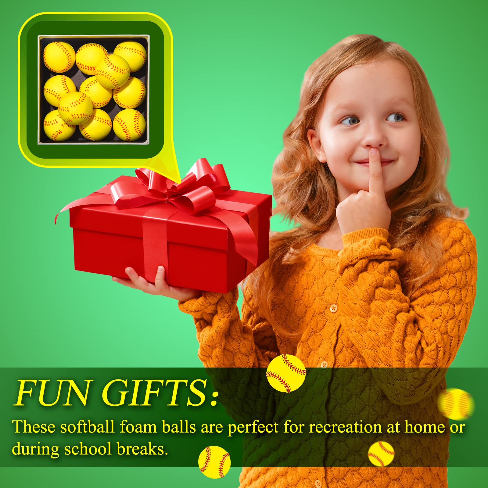Features: Enjoy a happy weekend with your family: If you are thinking about how to spend the cherished weekend time, it will be a nice choice to pick these practice softballs to play with your family. During the play time, you will feel happy and relaxed, and enjoy the exciting atmosphere. Practical gifts: You can give these baseball practice balls to family, colleagues and friends, and they will be very happy to receive such practical and useful gifts, so that they can play baseballs in the spare time. Specifications: Main color: yellow Size: approx. 6.5 cm/ 2.5 inches Main material: PU foam Package includes: 12 x Foam baseballs Warm notes: Small items, only suitable for people over 12 years old. Please allow slight deviation due to manual measurement. Please allow slight color differences due to different monitors.