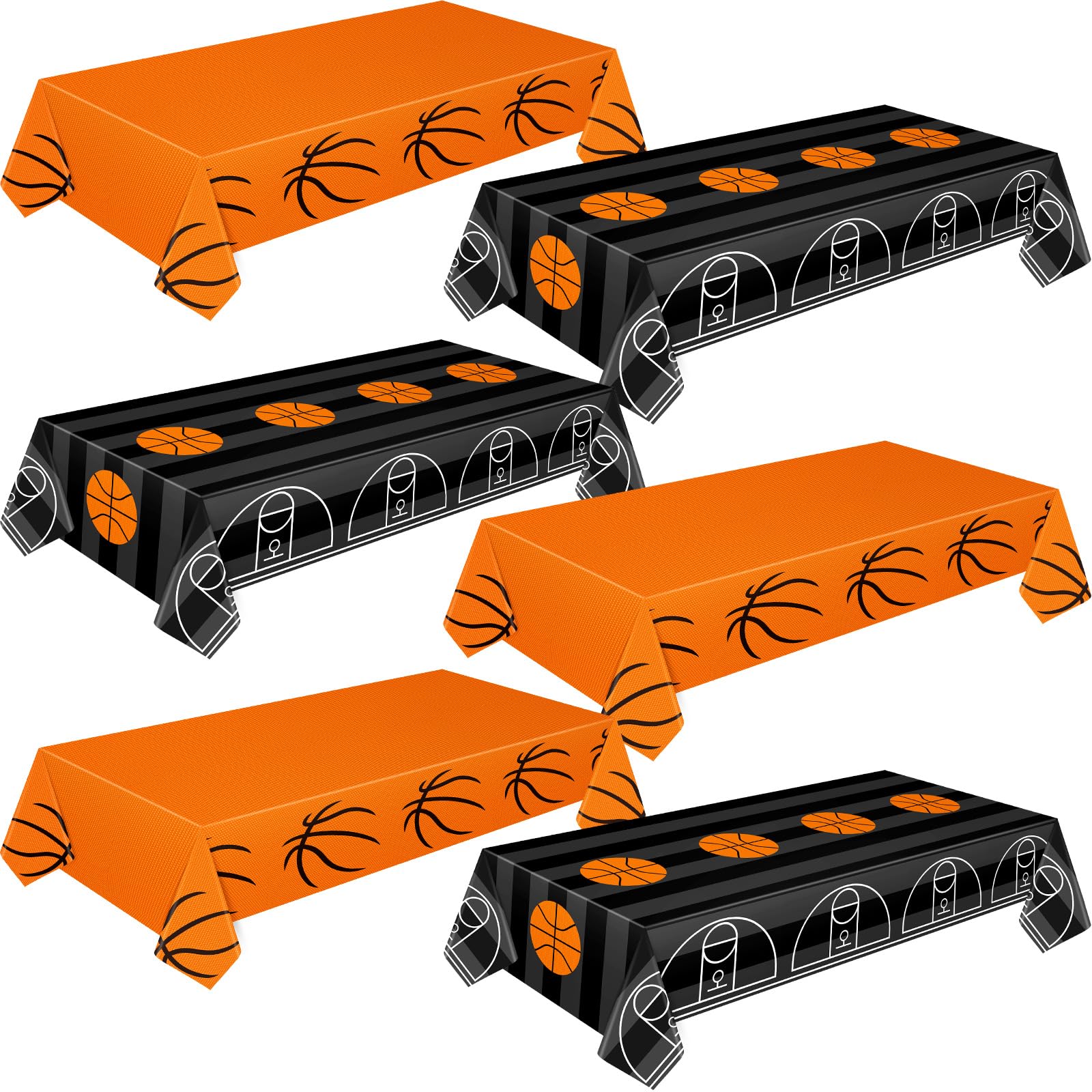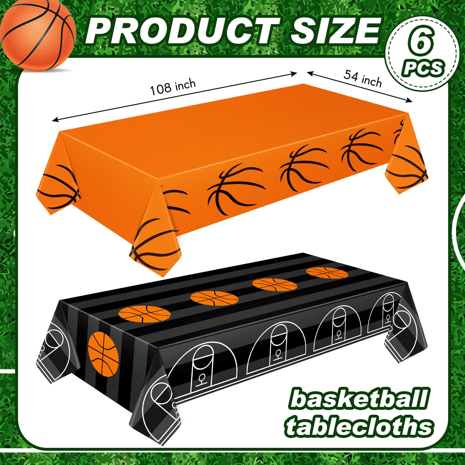 • Q: What sizes do the basketball tablecloths come in? A: Each basketball tablecloth measures 54 x 108 inches, providing ample coverage for most standard rectangular tables, making them suitable for various table sizes.
