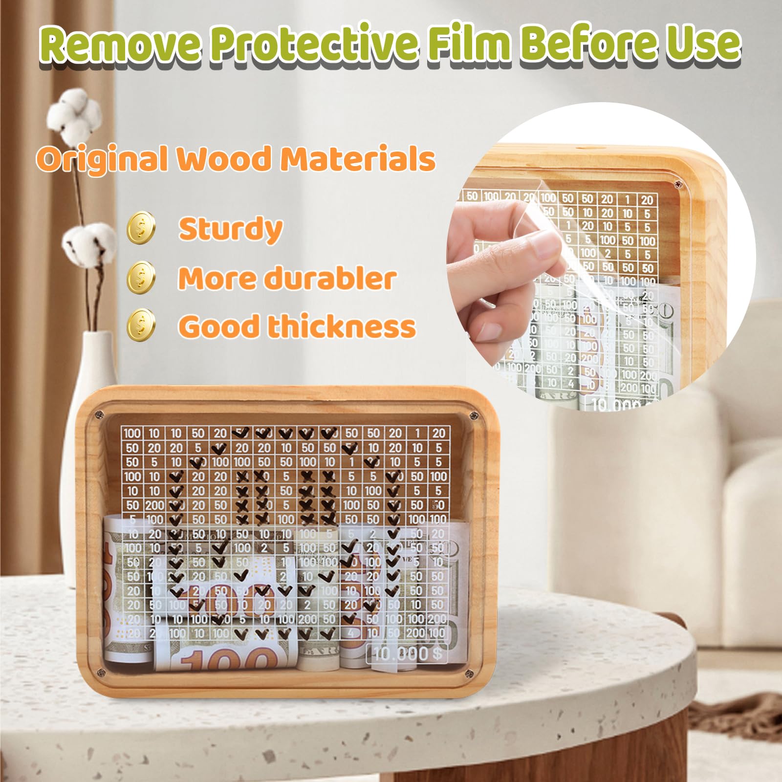 - Q: How does the design of the Money Saving Box encourage saving? A: The visible design with acrylic panels allows you to see your savings grow, which serves as a motivational incentive to continue saving. Additionally, it features engraved numbers and a dry erase marker for tracking progress.