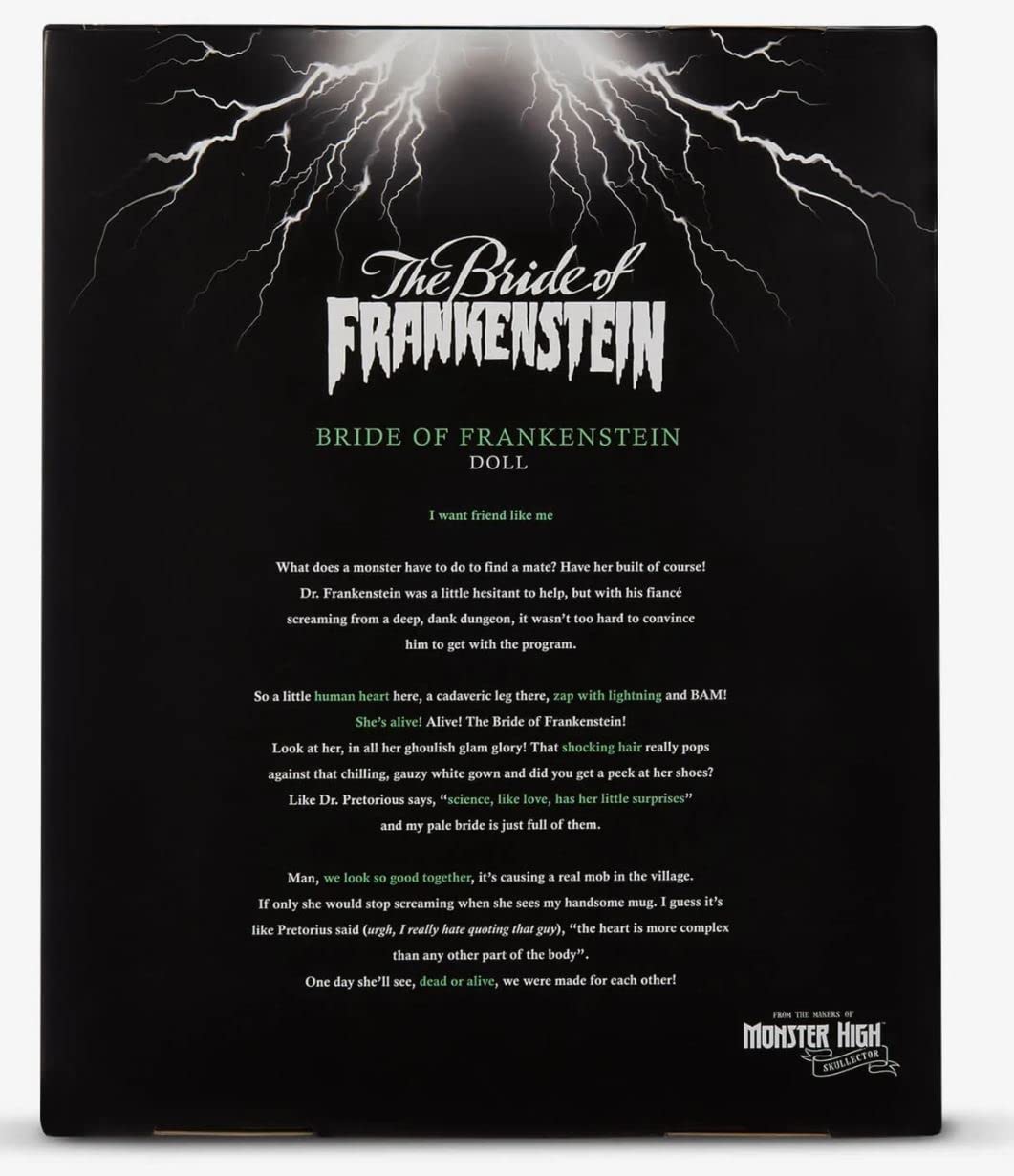 - Q: What makes the Bride of Frankenstein doll special? A: The Bride of Frankenstein doll features a unique hairdo with white lightning streaks and a gown inspired by her onscreen costume. It's designed with intricate details, including decorated heels.