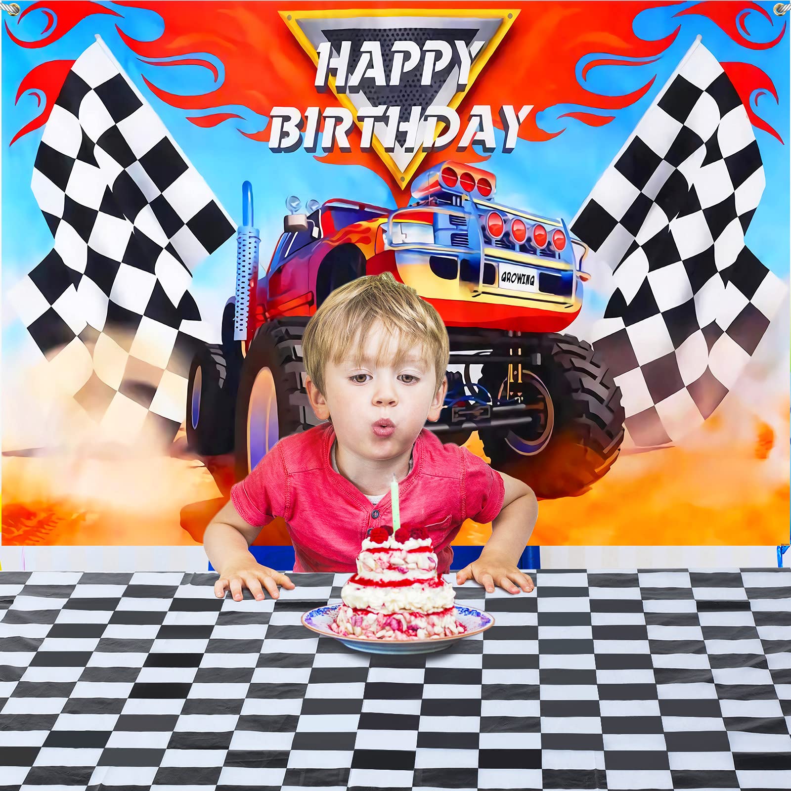 Monster Truck Party Supplies Include 1 Piece Monster Truck Backdrop 1 Piece Plastic Checkered Flag Tablecloth, Happy Birthday Mo