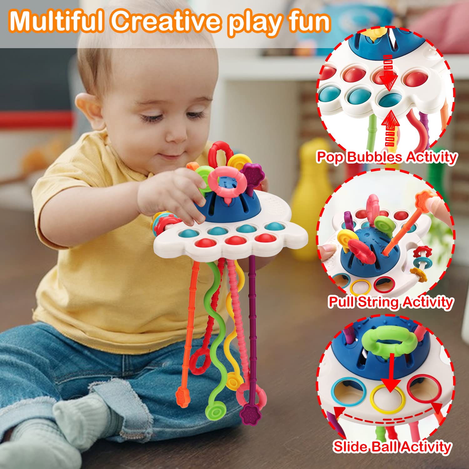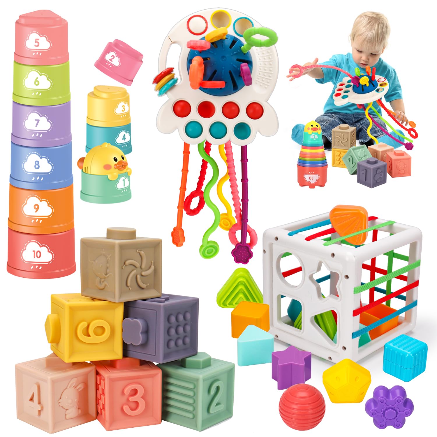 - Q: What types of activities do these toys promote for babies? A: The toys include pull-string features, stacking cups, shape sorters, and soft building blocks, all of which help develop hand-eye coordination, fine and gross motor skills, and cognitive abilities in infants.