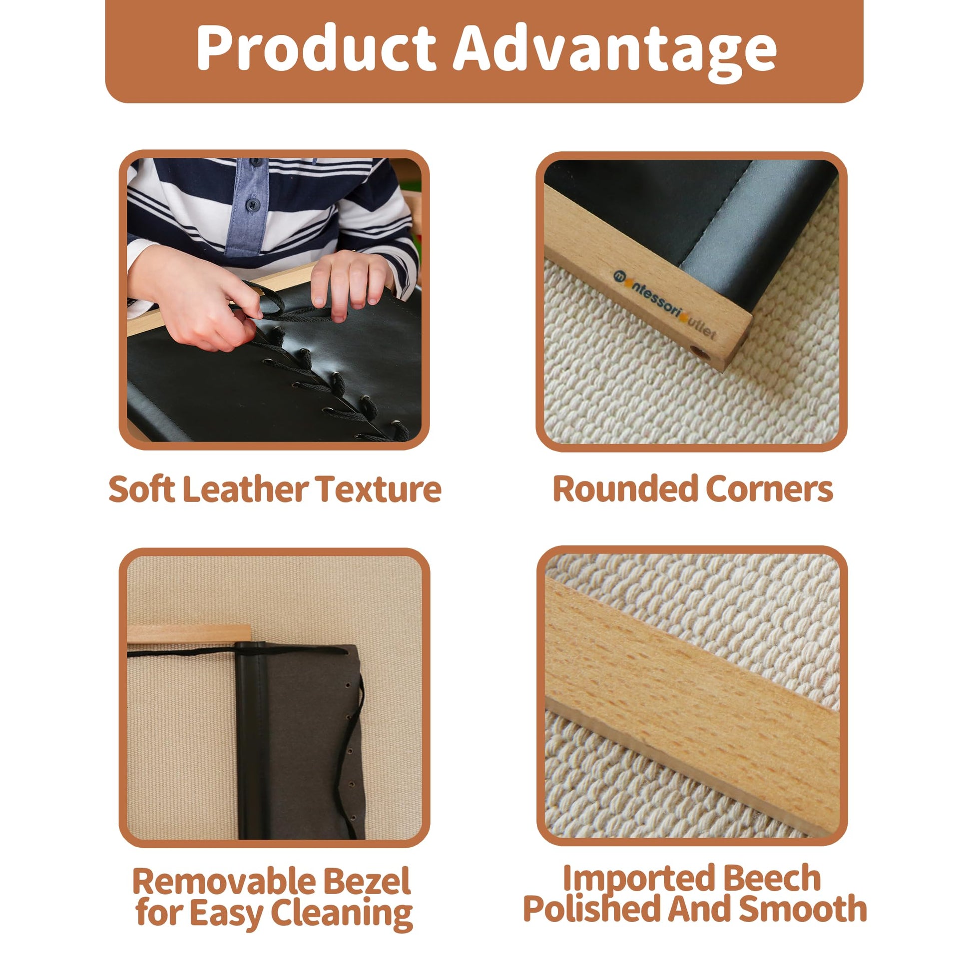 The direct aim in using the Montessori Dressing Frames is to help and encourage a child to dress independently. The child is indirectly advancing in fine motor skills and hand eye coordination. Each dressing frame focuses on one aspect of dressing and allows the child to practice each step several times in order to perfect it.Durable leather fabric attached on German beechwood frame, that can be removed and washed. Speical designed size for young children.