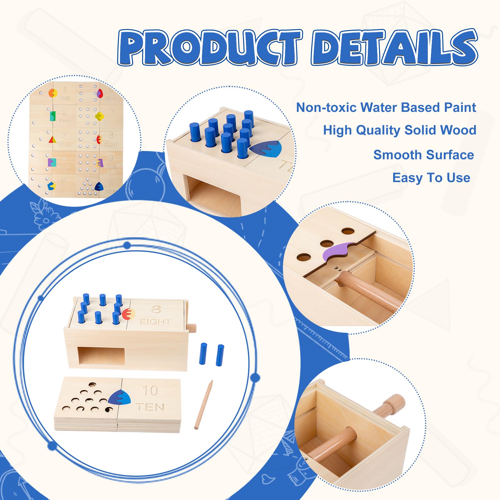 - Q: What materials are included with the Montessori Counting Peg Board? A: The set includes 20 counting peg boards, 10 blue wooden number rods, 1 wooden pen, and a wooden peg drop box, providing everything needed for engaging math activities.