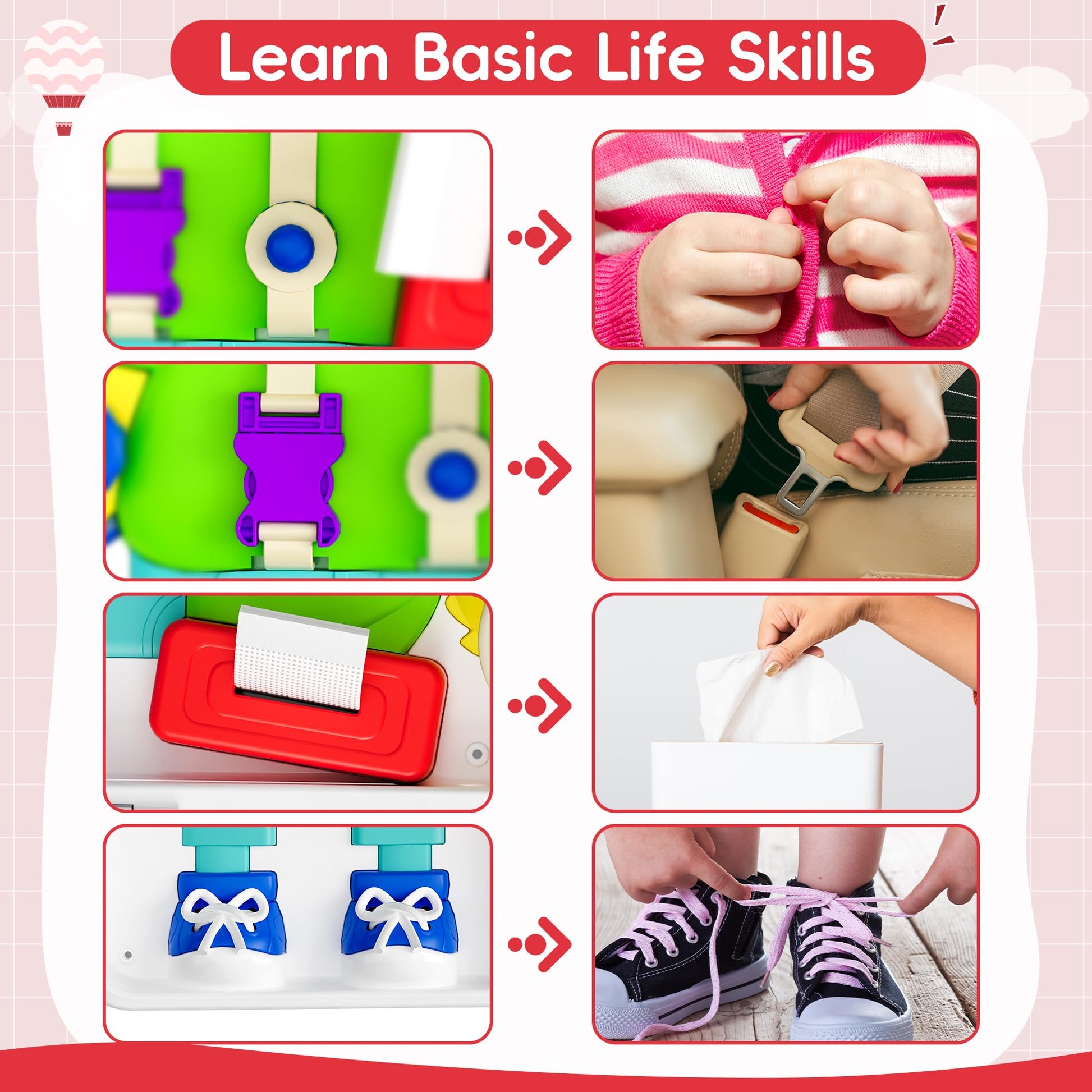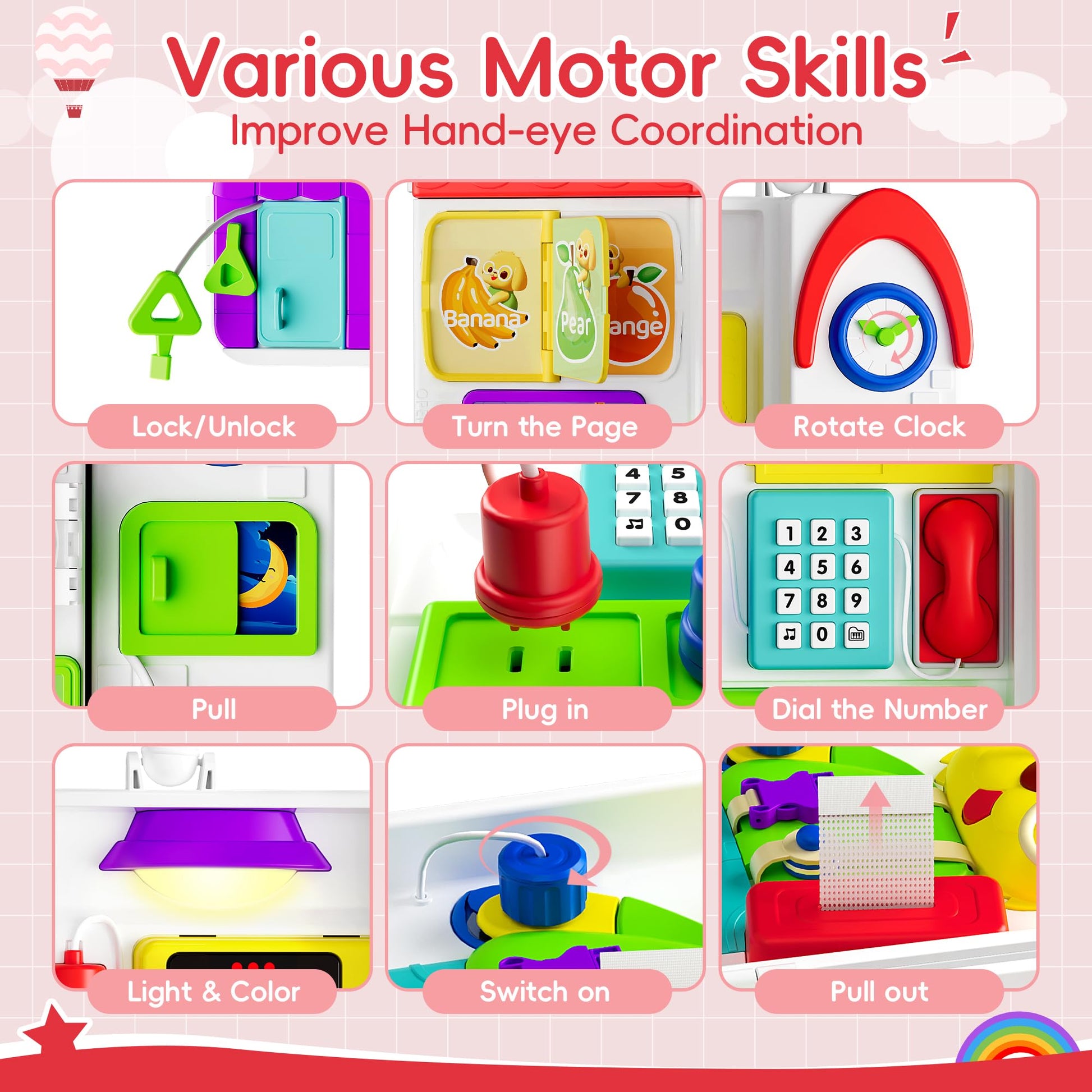 - Q: What types of activities does this toy include to engage toddlers? A: This Montessori toy features over 20 hands-on activities, such as pressing buttons, plugging in pieces, and opening doors, which stimulate curiosity and promote fine motor skills, hand-eye coordination, and imaginative play.