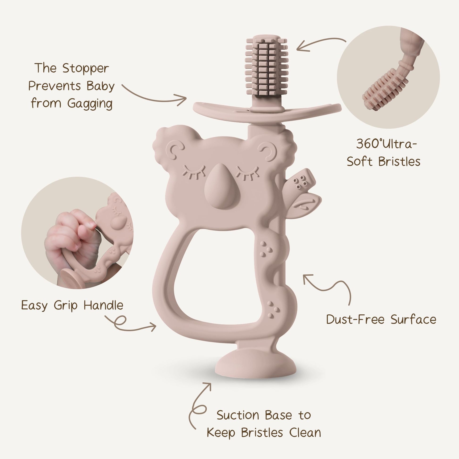 100% Food Grade Silicone - Moonkie only uses 100% food-safe silicone in our teething toys, without any fillers and chemical smells.Our products are free of BPA, PVC, phthalates, cadmium, lead and any other heavy metal,which meet or exceed US safety standards CPSIA and FDA. | Perfect for Teething and Toothbrushing - Our koala transitional silicone toothbrush works as toothbrush and baby teething toy. The ultra-soft bristles massage your little one's tender teeth and gums 360