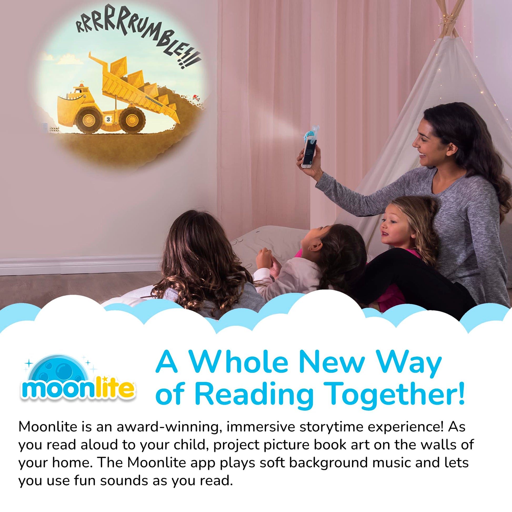 The Award-Winning Moonlite Storytime Projector Turns Your Smartphone Into A Storybook Projector; It’S Easy To Clip The Included Story Book Projecting Device Onto Your Mobile Phone, Turn On The Flashlight, And Shine Children'S Stories Onto The Wall Or Ceiling For Your Kids. Read Along To The Bright, Colorful Story Reels And Use The Moonlite App To Play In-App Sound Effects For A Truly Immersive Bedtime Story Experience. Moonlite Story Reels Are An Ideal Gift For Beginner Readers, Toddlers And Kids Aged 1, 2 And 3 Years Old. As Kids Follow Along, They Grow Their Language Skills, Imagination And Understanding Of The World Around Them. Foster A Love Of Reading And Develop Your Little One’S Big Imagination Along The Way With The Moonlite Story Reels.