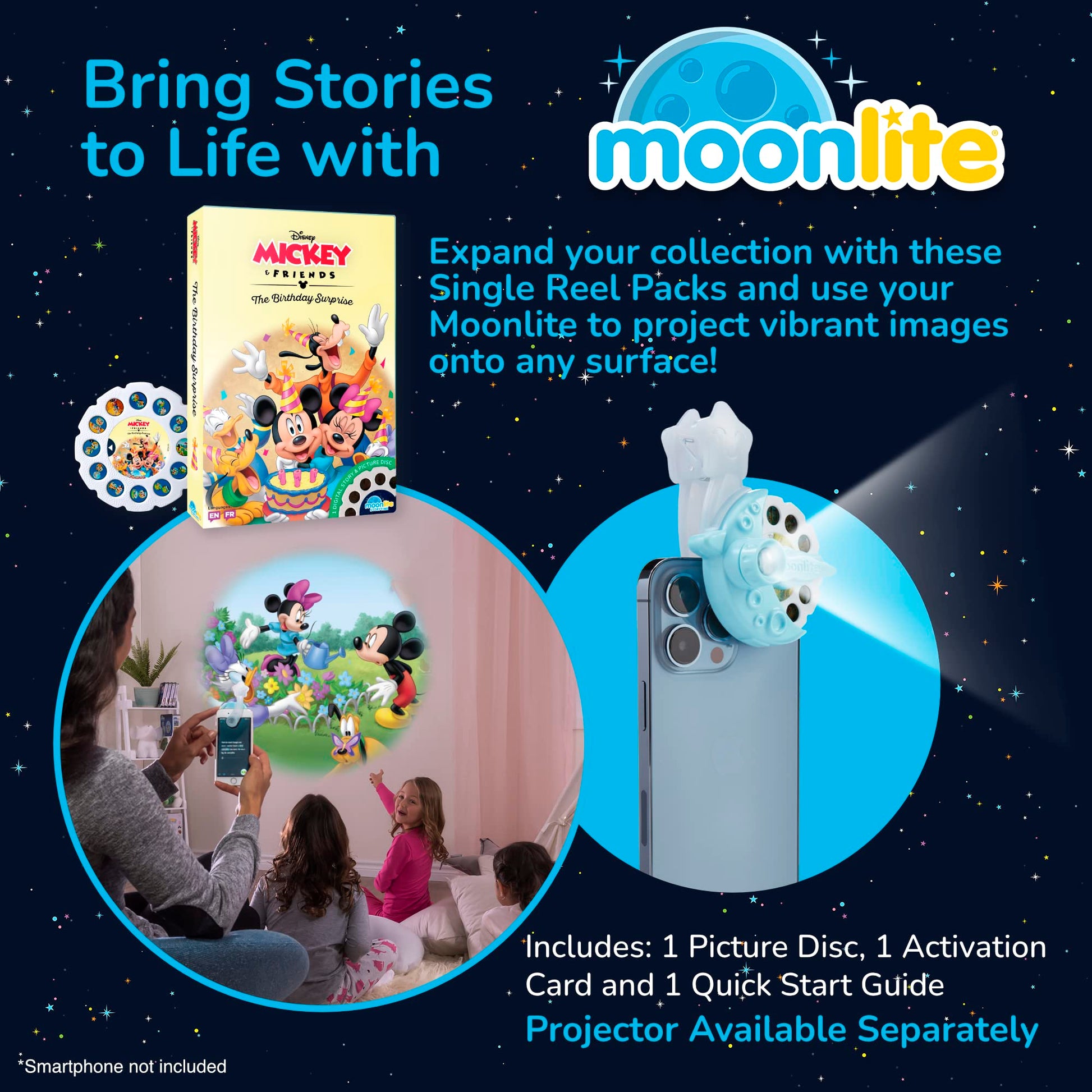 Story Time Enchantment Continues With Moonlite’S Individual Story Reels! Add Mickey And Friends The Birthday Surprise To Your Moonlite Collection And Introduce Your Child To A Wonderful Tale They’Ll Want To Hear Again And Again. Maybe This One Is Already Your Baby’S Favorite Book; They’Ll Love To See It Light Up On The Walls Of Your Home For A Magical New Way To Enjoy Their Favorite Bedtime Story With You! Slide The Story Reel Into The Moonlite Projector, Which Is Available Separately. If You Or The Lucky Kid You’Re Gifting Moonlite To Doesn’T Have The Projector Just Yet, Head On Over To Our Gift Packs (Each One Includes A Projector!). Snuggle In With Your Child And Enjoy Beautiful And Vibrant Illustrations, Accompanying In-App Story Text And Sound Effects. With The Help Of The Moonlite Companion App, You’Ll Be Able To Read Along To Each Image And Truly Create A Magical And Immersive Reading Experience That Brings These Exciting Tales To Life! As Kids Follow Along, They Will Grow Their Language Skills, Imagination, And Understanding Of The World Around Them. Ignite A Love Of Reading And Develop Your Little Kid’S Big Imagination With The Always Growing Moonlite Storytime Library Of Storybook Reels!