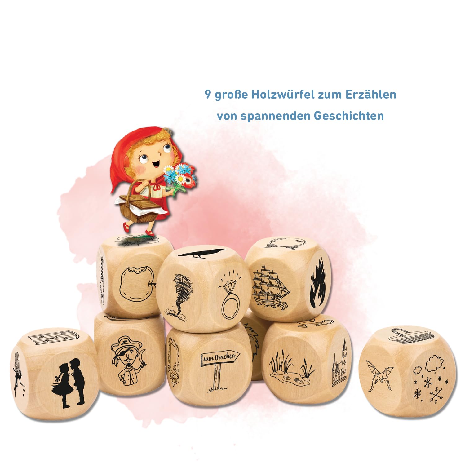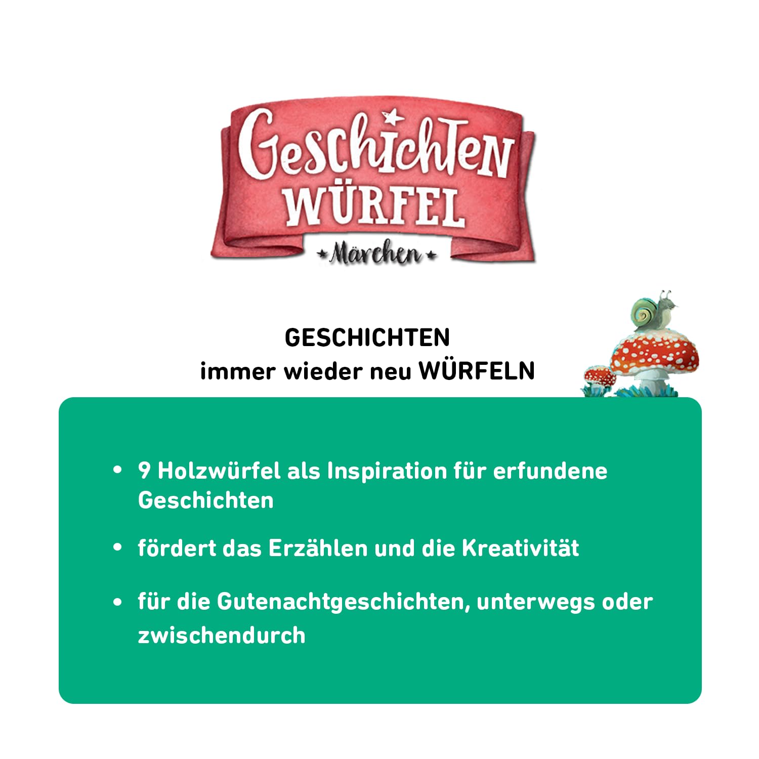 9 Wrfel fr ein eigenes Mrchen: Der Fantasie sind keine Grenzen gesetzt! Diese magischen Geschichtenwrfel helfen Kindern dabei, ihre eigenen Geschichten voller magischer Feen, mutiger Held*innen und bser Ungeheugen zu erschaffen. Anhand 54 mrchenhafter Symbole von Prinzessinnen, Drachen, Zauberern und Co. werden die Spieler*innen eingeladen, in eine sagenhafte Welt einzutauchen. Durch kreatives Kombinieren der gewrfelten Motive entsteht eine eigene Geschichte voller Abenteuer, Fabelwesen, Geheimnisse und Gefahren. Die Geschichtenwrfel eignen sich perfekt fr die etwas andere Gute-Nacht-Geschichte, als Beschftigung am verregneten Nachmittag oder als Aufgabe in der Schule und frdern beim Spielen die Kreativitt und das Erzhlen. Ganz egal, wie die Wrfel fallen und wie das Mrchen weitergeht: Jede einzigartige Geschichte ldt zum Trumen und Fantasieren ber Besenflge, Monsterfreunde und prunkvolle Schlsser ein! - schafft Sprachanlsse - frdert das Erzhlen und die Kreativitt - fr den Schul- oder Nachhilfeunterricht geeignet - groe Holzwrfel mit 54 mrchenhaften Symbols - alleine und zusammen in groen Gruppen spielbar - ideal fr zwischendurch und unununited by way So wiring. d's played: - Wer am Zug ist, wirft alle 9 Wrfel. - Mit den gewrfelten Symbolen erzhlt der*die Spieler*in eine eigene Geschichte. - Danach ist der*die nchste Spieler*in am Zug. Inhalt: 9 Wrfel (FSC-zertifiziertes Holz) 1 Anleitung