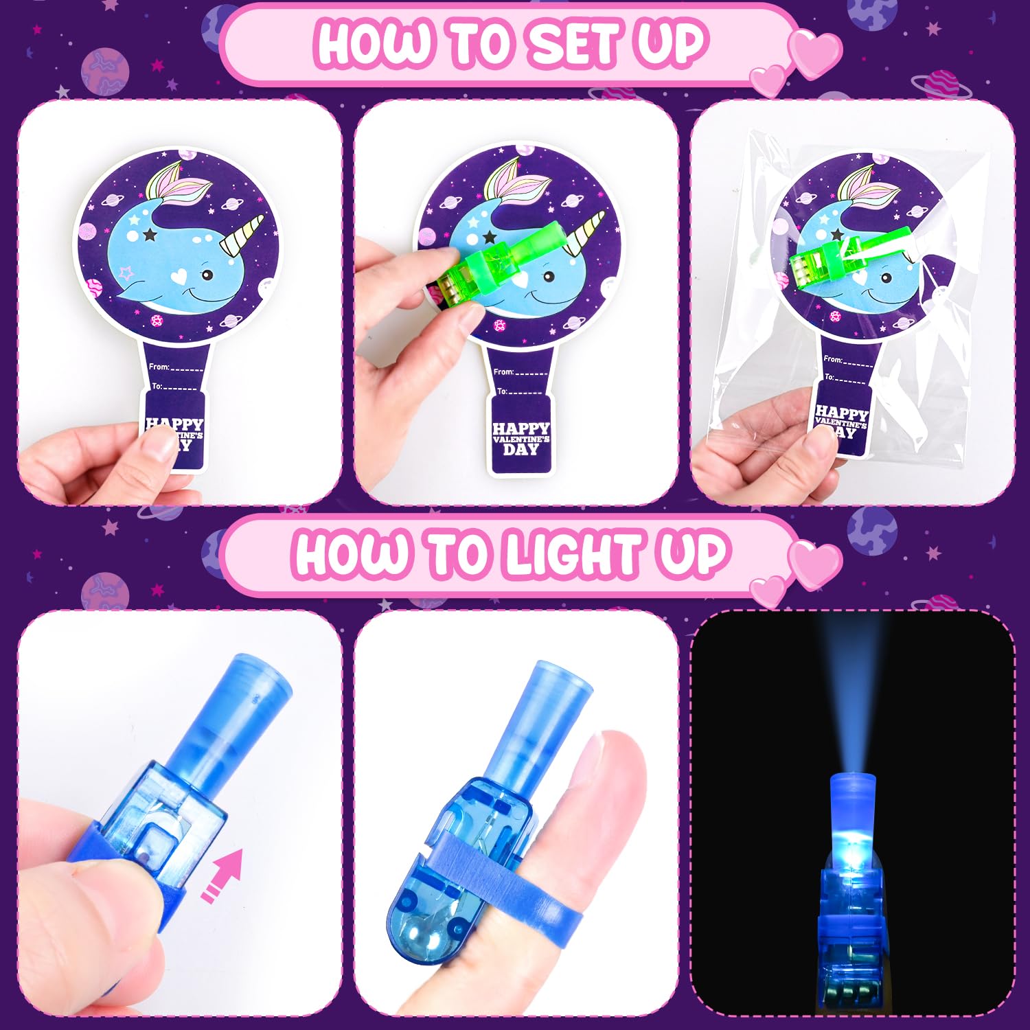 MOVINPE Valentines Day Exchange Gifts for Kids Classroom, 28 Packs Finger Lights with Valentines Cards - Light Up Finger Flashli