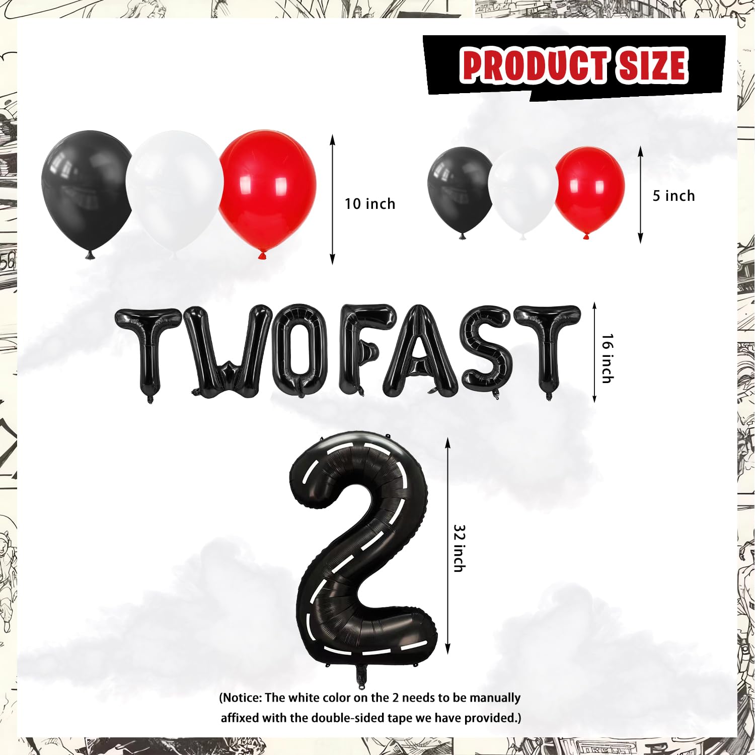 - Q: What items are included in the Mpanwen Two Fast Birthday Decorations set? A: The Mpanwen Two Fast Birthday Decorations set includes a backdrop, 24 cupcake toppers, 24 cupcake wrappers, 75 latex balloons in 6 styles, 8 foil balloons, a highchair nanner, a banner, 4 flags, 4 centerpieces, a cake topper, a crown, a poster, and a tablecloth.
