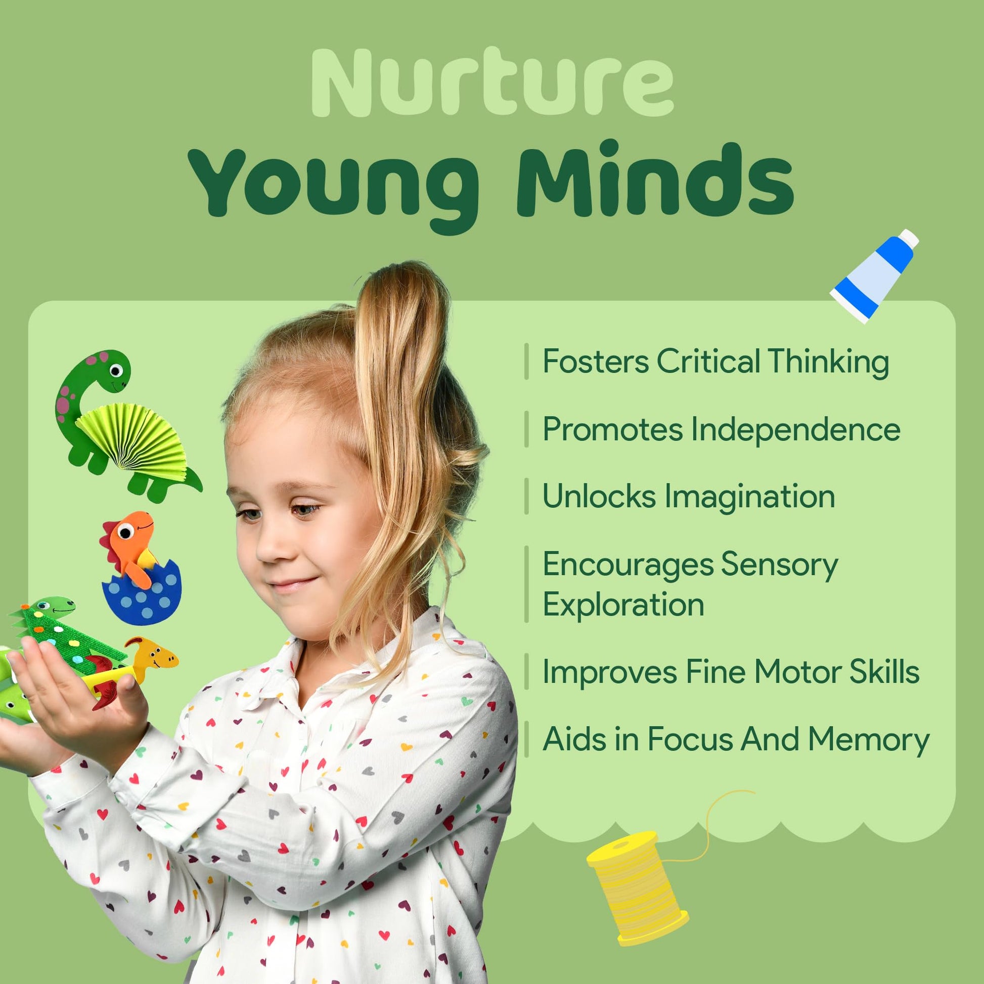 Mumaloo Dinosaur Crafts For Kids Ages 4-8 Prehistoric kids craft kits - where imagination roars to life! Meet Sabina, the crafty mom behind Mumaloo crafts in a box! She knows firsthand how tricky it can be to gather materials and come up with craft ideas, which is why Mumaloo was born. From ideas to easy instructions and all the art supplies you need; this is your one stop shop for kids crafts. Now, families can dive into heaps of awesome art projects for kids with just one purchase. Easy, peasy, crafty squeezy! Whats Inside this Kids Arts and Crafts Box? Everything! These dinosaur art activity kits come fully stocked with all the essentials - glue, paper, pom-poms, popsicle sticks, and an exciting mix of materials to craft 10 dino-tastic creations. Individually wrapped and organized project by project, cleanup is a breeze and nothing gets lost! Just open one animal craft at a time and let the creativity roll. Independent or Shared Play With clear, picture instructions, Mumaloo easy crafts for 3 year olds + can be done independently or enjoyed as a fun family activity. Simple yet engaging, these art kits for kids 4-6 encourage problem-solving, patience, and hands-on creativity, keeping little minds active and entertained. Learn. Create. Explore. Beyond the fun, this educational kids art set nurtures sensory development, fine motor skills, decision-making, and memory development - while keeping screen time to a minimum. Let your child design, build, and explore the prehistoric world with their own hands. Unique Gift Idea for 3, 4, 5, 6, 7 and 8 year olds Searching for dinosaur gifts or just fun things for kids to do? These kindergarten and toddler crafts provide hours of hands-on fun. Great for holidays, birthdays, afterschool, or a special surprise, each art box includes 10 engaging girls & boys crafts that inspire creativity, spark curiosity, promote independent play, and create unforgettable memories Warning: CHOKING HAZARD - Small parts. Not suitable for children under 3.