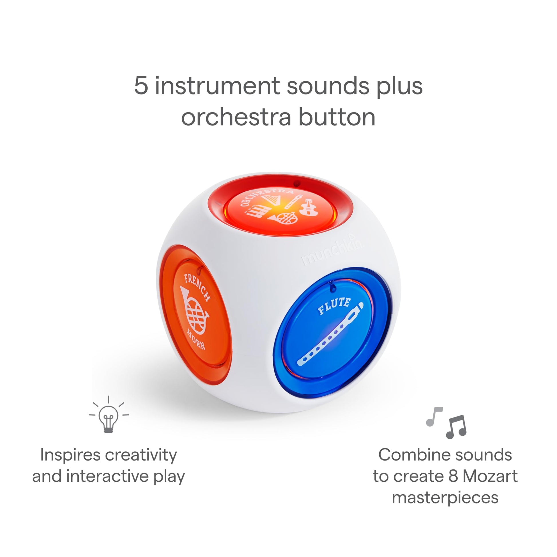 - Q: What features does the Munchkin Mozart Magic Cube offer? A: This educational toy features five instrument sounds, including harp, flute, French horn, piano, and violin, and allows children to create eight classical music masterpieces. It also has an orchestra button that plays all instruments simultaneously, with lights that flash to the tempo of the music.