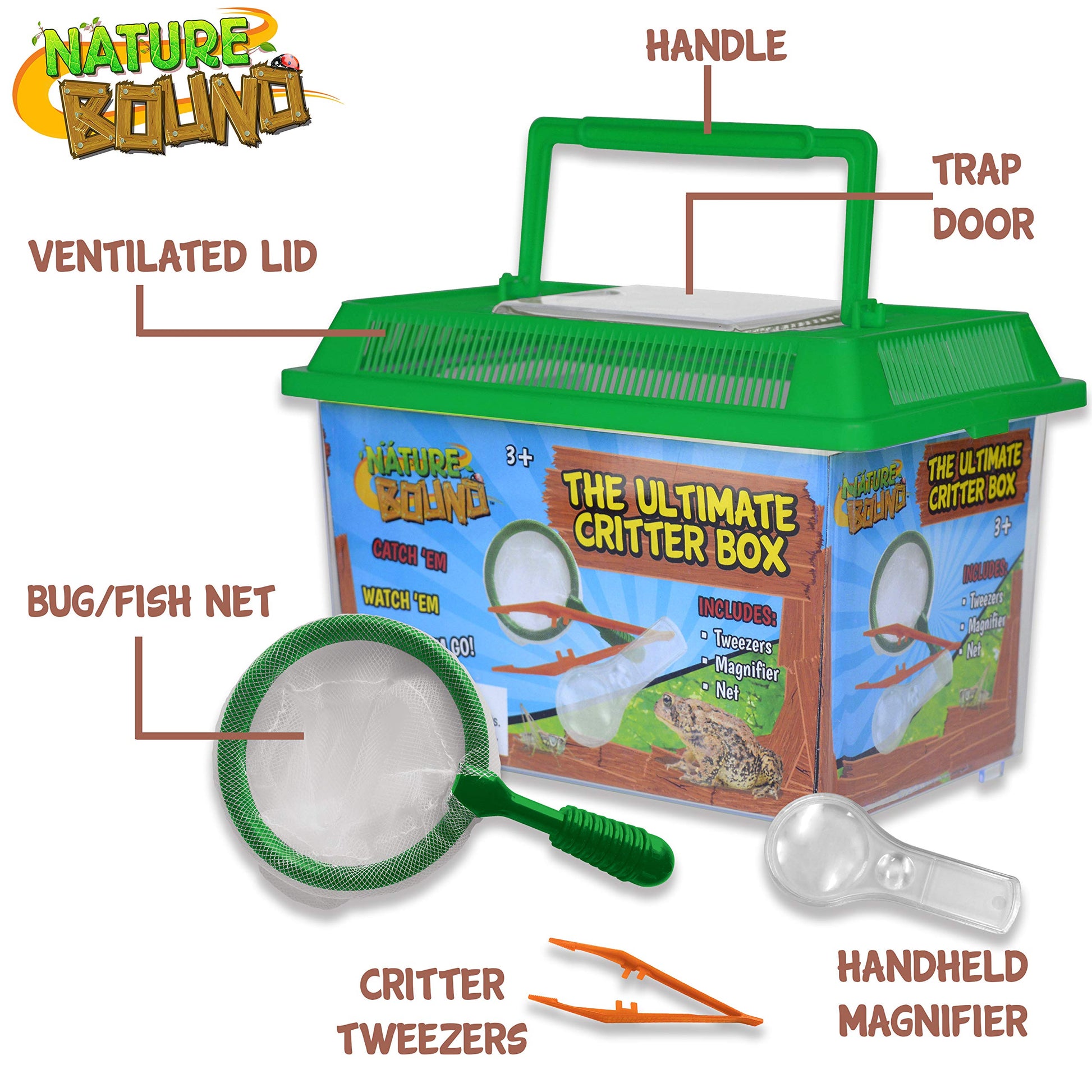 - Q: What is included in the Nature Bound Ultimate Critter Box Habitat Kit? A: The Nature Bound Ultimate Critter Box Habitat Kit includes a critter box with a lid and handle, a net for catching insects, tweezers for handling them safely, and a magnifier for close-up observation.