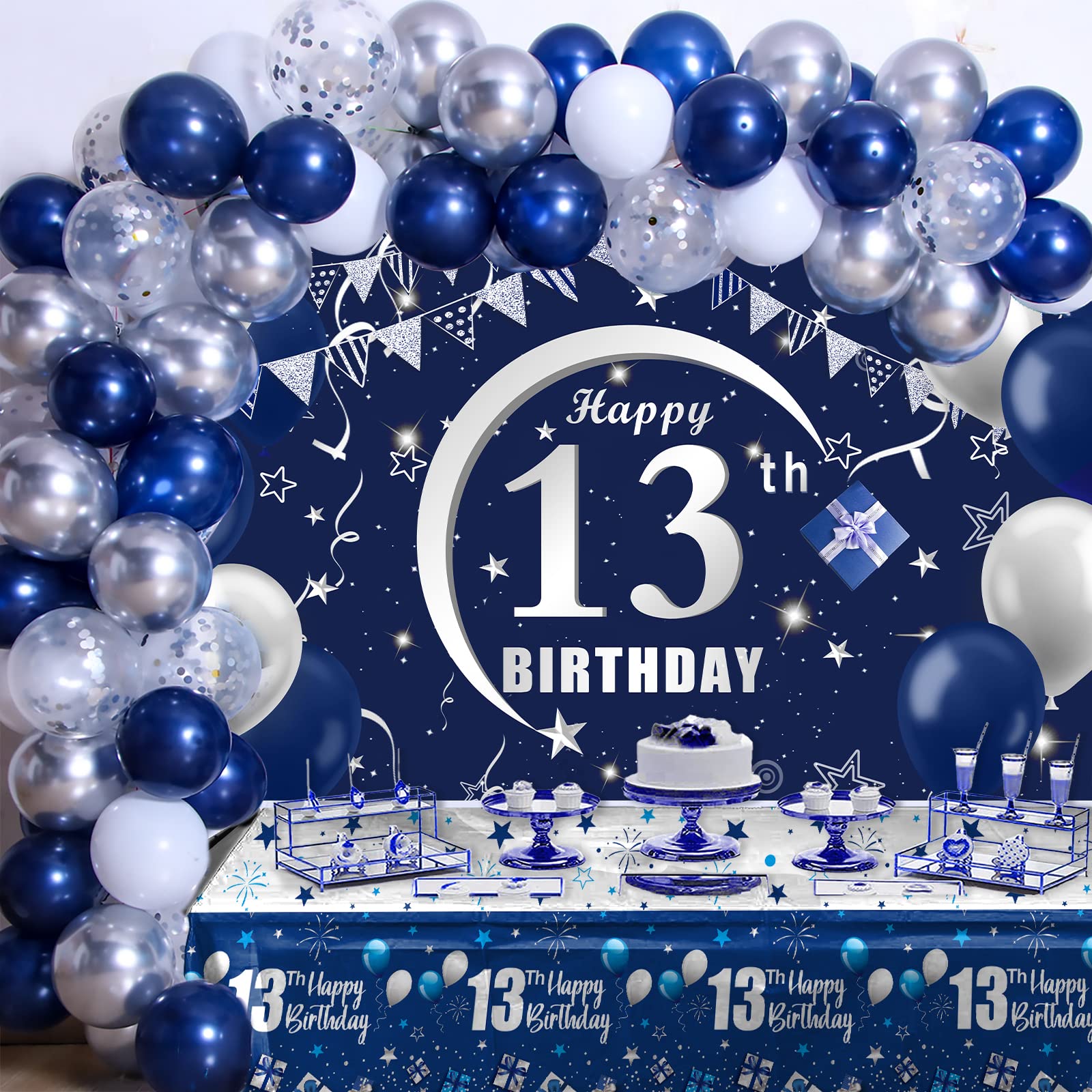 - Q: What items are included in the Navy Blue 13th Birthday Decorations kit? A: The kit includes 20 dark blue balloons, 15 silvery balloons, 5 white balloons, 10 confetti balloons, 1 backdrop (70*43 inches), 1 tablecloth (70*42 inches), 1 ribbon, 1 arch strip, and 1 set of dot labels.