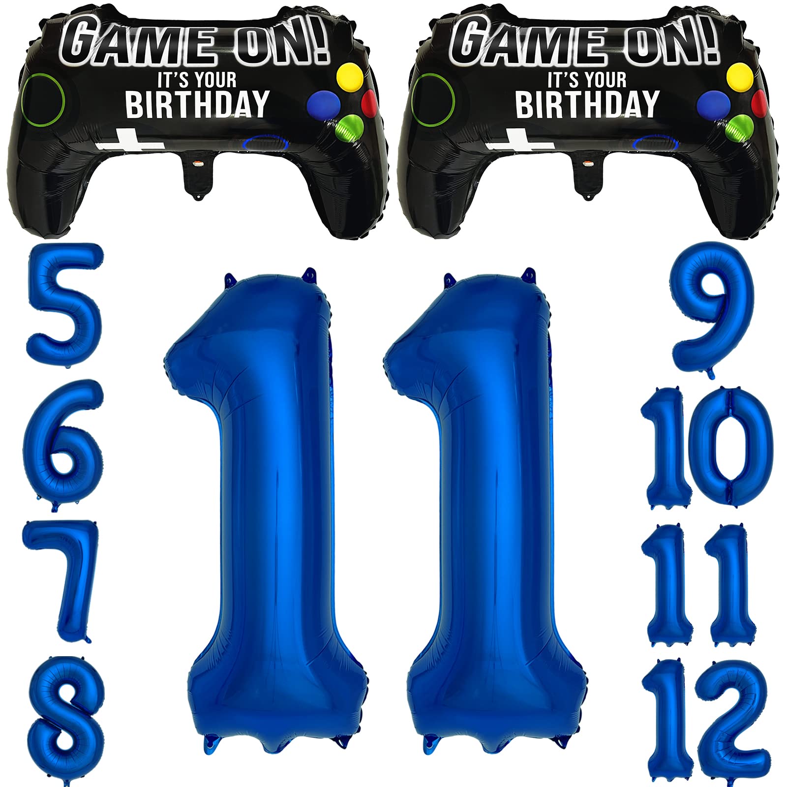 - Q: What type of balloons are included in the Navy Blue Video Game Party Supplies? A: The package includes two black 'Game On' controller mylar balloons and a giant royal blue number 11 balloon, perfect for an 11th birthday party themed around gaming.