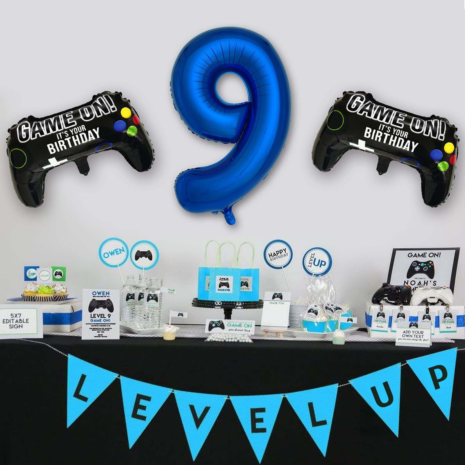 - Q: What types of balloons are included in the Navy Blue Video Game Party Supplies set? A: The set includes two black game on controller mylar balloons and a giant royal blue number 9 balloon, perfect for a gaming-themed birthday celebration.