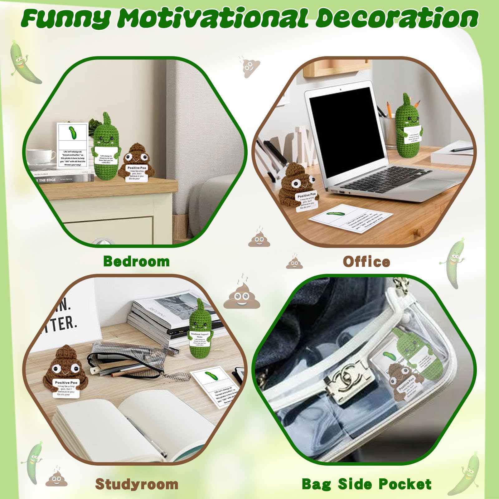 Unique and Exquisite Design: Positive crochet pickle has a cute novelty look and a fun little tail design. His partner poo has a look of ''wisdom'' in his eyes that makes everyone who sees it can't help but laugh out loud! The words of encouragement in their hands are so warm and welcoming. This fun wool knitted poop and pickle is sure to catch everyone's eye! | Handmade Crochet Kit: These funny positive poo and pickle are made of high quality woolen yarn, which is soft and comfortable to the touch, and the wool is resistant to shedding and fading, offering the advantages of durability and strength. Because they are handmade, each poo and pickle is unique | Adorable Decoration: They are tiny and easy to carry. The bottom of the positive poo is flat can be placed steadily, positive crochet pickle will need to have a dependable item to stand on the table, they are used as an interesting decoration for the office desktop. The crocheted details are realistic and add to the charm of the poo and pickle | Emotional Crocheted Support Poo Pickle: Each emotional crochet poo/pickle plush comes with a positive card to cheer up. It encourages creativity, connection, and the sharing of positive energy in a simple and accessible way. If someone who is going through an unhappy time, give this funny crochet poo/pickle to him or her | Funny Gifts: Still struggling with what to get your friends and family for the holidays? This handmade positive poo and crochet pickle set are perfect for Christmas, Valentine's Day, and birthday party. Also a huge hit as gag gifts, funny white elephant gifts and retirement gifts