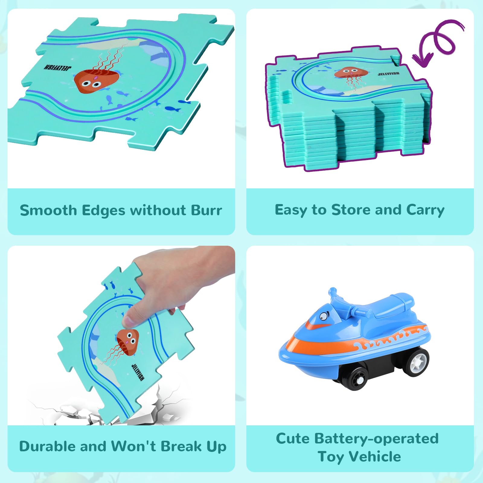 - Q: What is included in the puzzle racer kids car track set? A: The set includes 12 puzzle pieces, 12 road signs, and 1 boat-shaped vehicle (requires 1 AAA battery, not included) for an engaging play experience.