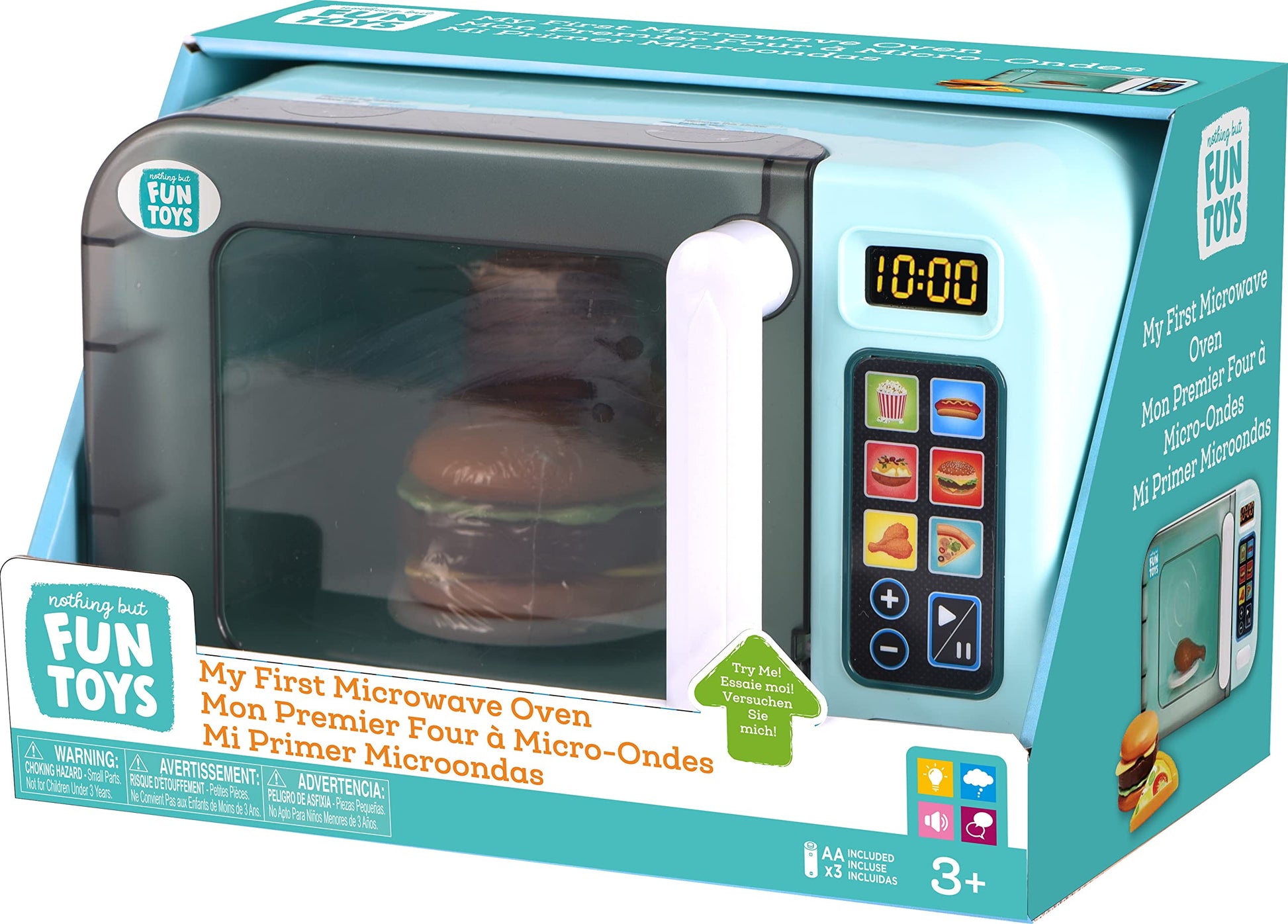 My First Microwave Oven Playset by Nothing But Fun Toys has many custom features for a realistic pretend play experience. The microwave has interior lighting and fixed rotatable turntable, exterior lights and sounds with functional buttons, it makes a realistic motor sound when it is cooking and makes an ding sound when the toy food is done. This kid sized microwave toy comes with natural looking food toys; a pizza, a chicken leg and an assembled cheeseburger. Batteries are included (3 x AA) meaning it's ready to play. This playset is part of the Nothing But Fun Toys household product series and is a great companion to any kids playroom or pretend kitchen. This toy is perfectly designed for children ages 3+ years of age. Nothing But Fun Toys is a curated collection of historically top selling plastic preschool toys which have been contemporarily redesigned by world class product engineers carefully designed for children to have the best experience imaginable. All our toys come in best-in-class consumer friendly packaging perfect for gifting.