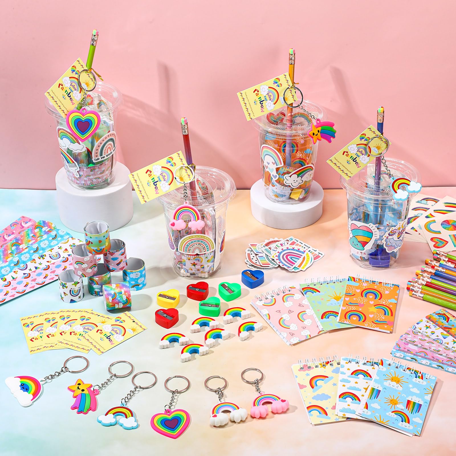 Features: Nice for gifting: Our rainbow favors set may be a delightful gift to any child. It creates a joyous surprise for birthdays, holidays, or back to school season. Fashionable and trendy: With the resurgence of the rainbow trend, kids will love showing off their trendy and colorful stationery set for kids to their friends. This fun theme makes learning more attractive and stimulates the interest of kids in their studies. Specifications: Material: Gift cup: PET Notebooks: paper Keychains: acrylic Slap bracelets: PVC Stickers: waterproof PVC adhesive Cards: kraft paper Color: colorful Gift cup size: about 4.76 x 3.86 inches Gift cup capacity: about 16 oz Package includes: 20 x Mini notebooks 20 x Rainbow pencils 20 x Slap bracelets 20 x Keychains 20 x Rulers 20 x Erasers 20 x Pencil sharpeners 20 x Tattoo stickers 20 x Wish cards 20 x PET cups with lids 50 x Graffiti stickers 1 Bag packaging sealed wires (50 pcs) Notes: Manual measurement, please allow slight errors on size. The color may exist a slight difference due to different screen displays. Suitable for people over 12 years old, and its recommended to use under the supervision of adults in case of choking risk.