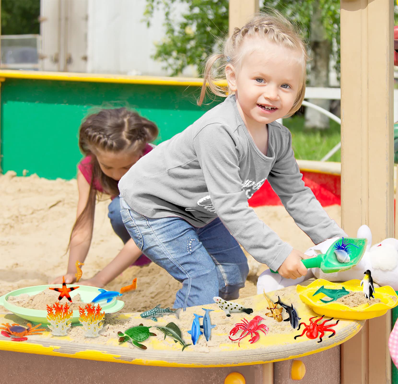 • Q: What types of sea animals are included in the Ocean Sea Animal toy set? A: The Ocean Sea Animal toy set includes a variety of realistic sea creatures such as dolphins, seahorses, octopuses, whales, starfish, hammerhead sharks, crabs, stingrays, sea turtles, and phocidae, along with two coral pieces.