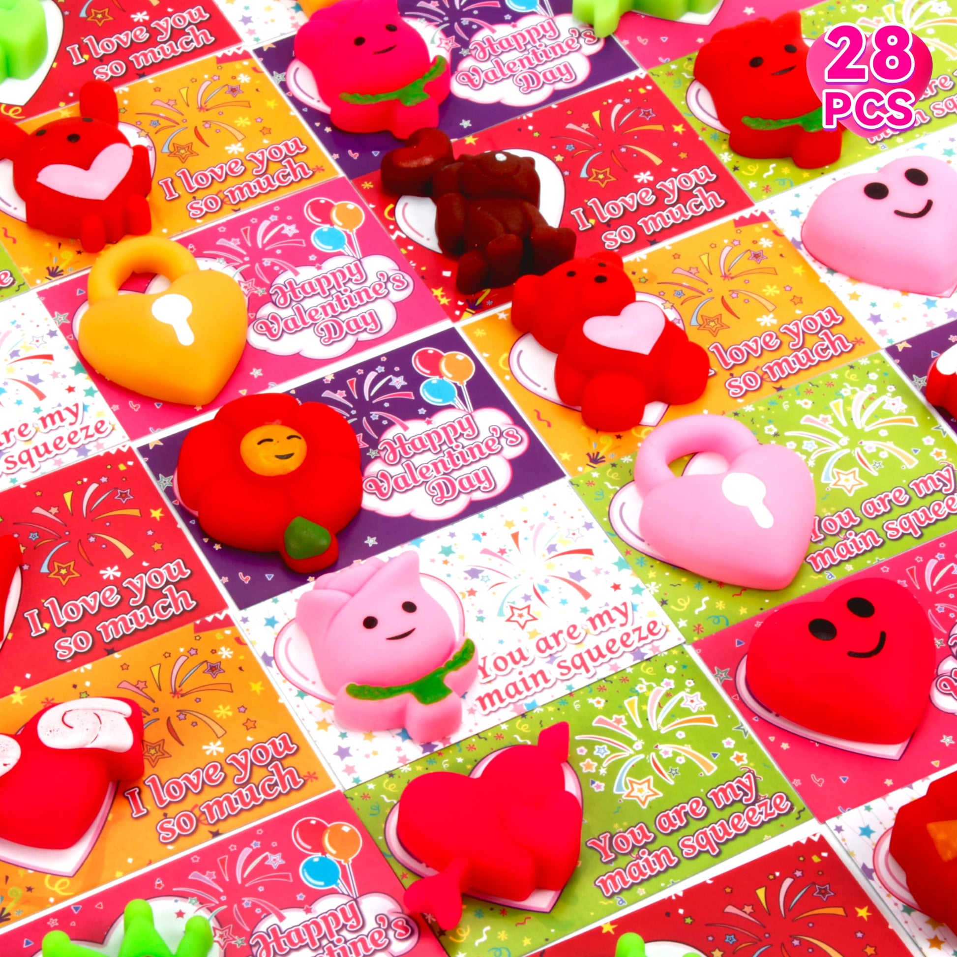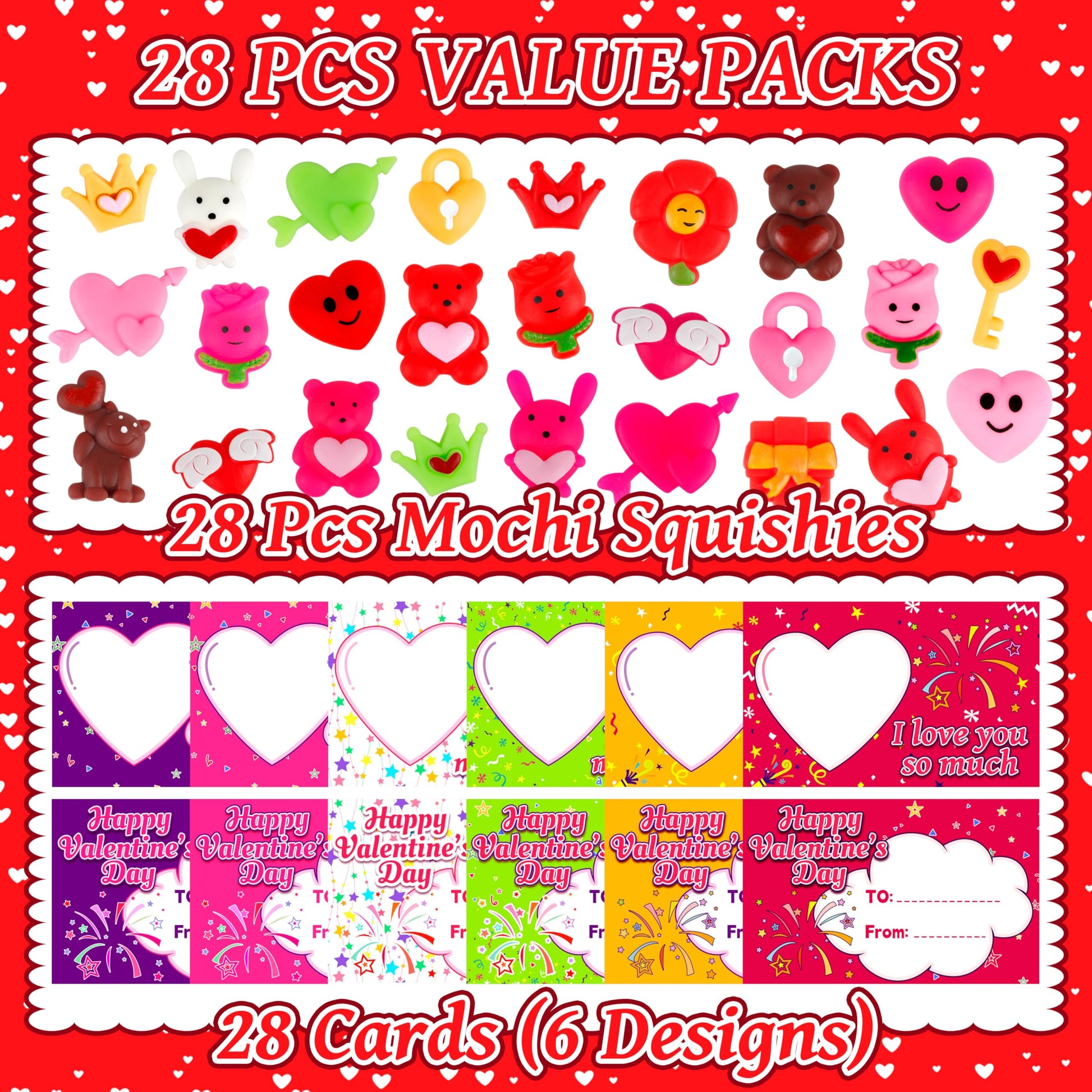 - Q: What is included in the OCTERIC Valentine's Day pack? A: The OCTERIC Valentine's Day pack includes 28 cute cards featuring 6 different designs, along with 28 vibrant mochi squishy toys. This super value pack is perfect for gifting on Valentine's Day.