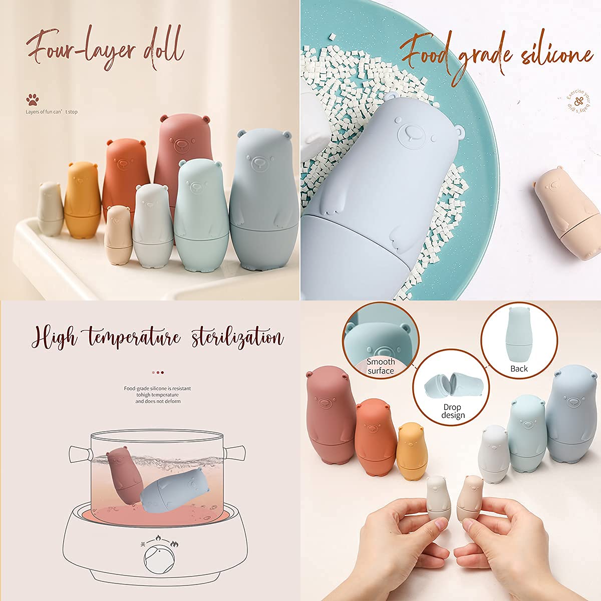 • Q: What materials are the nesting dolls made from? A: These nesting dolls are made from high-quality silicone, ensuring they are durable, safe, and easy to clean for young children.