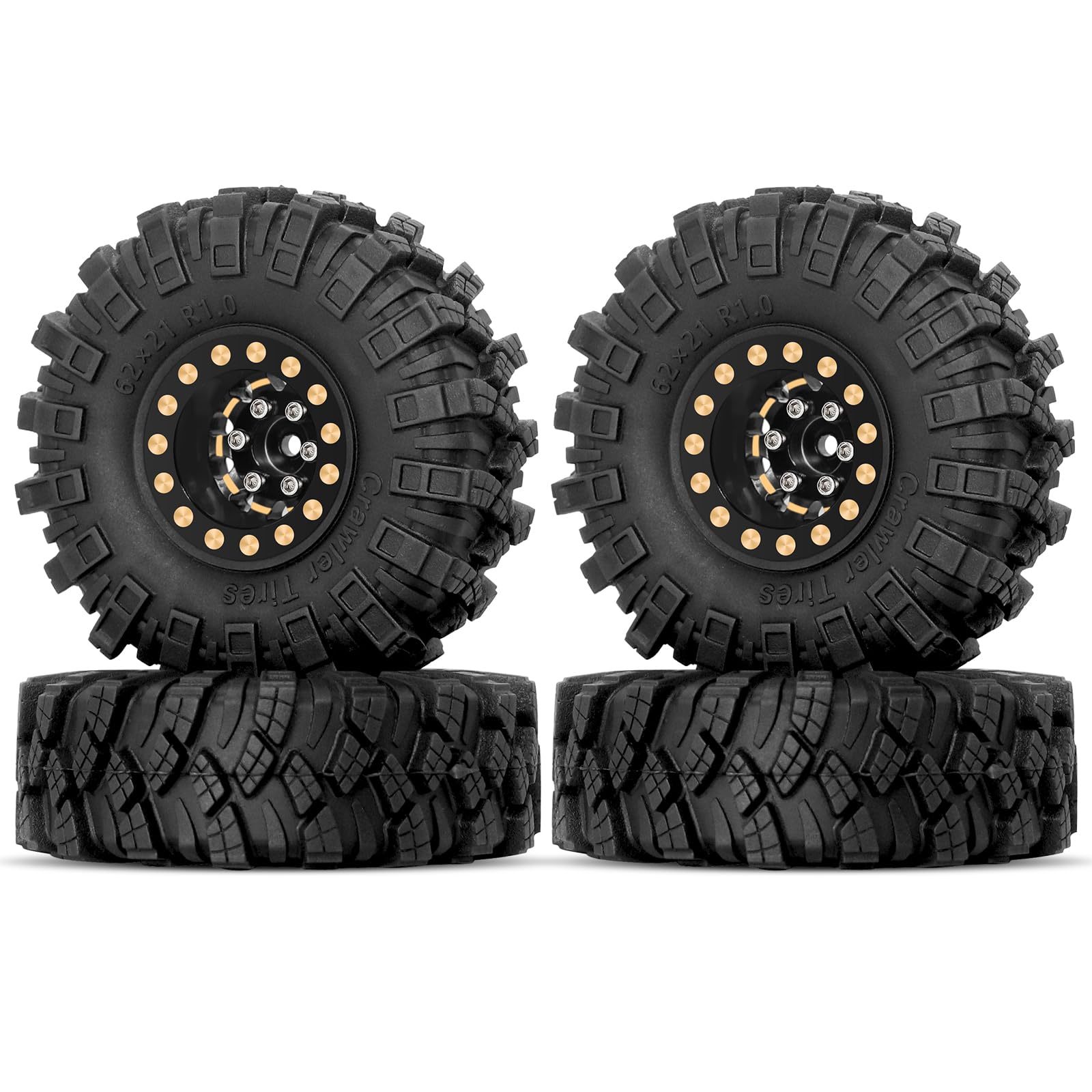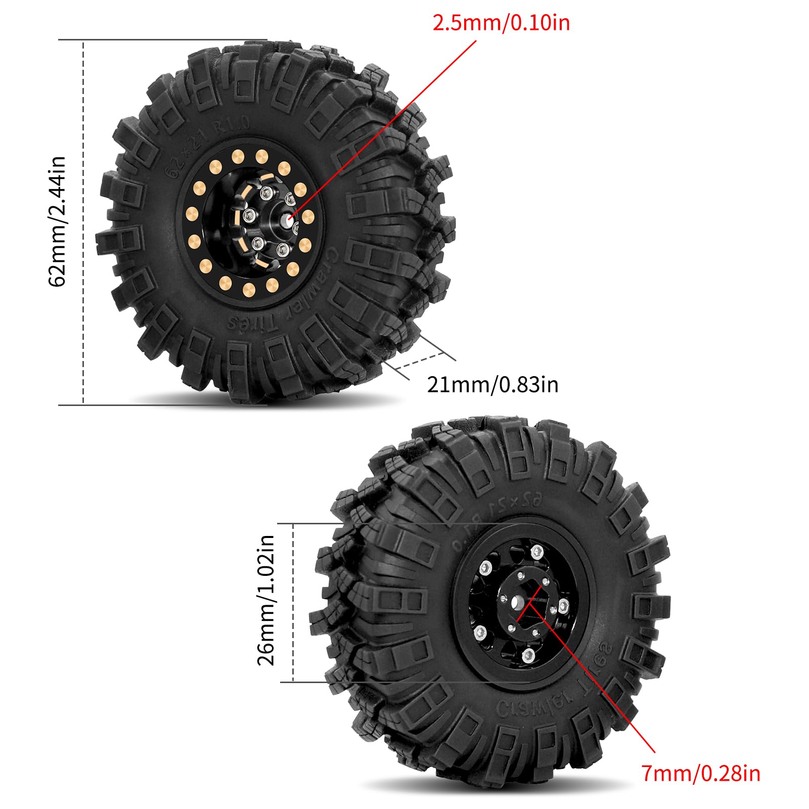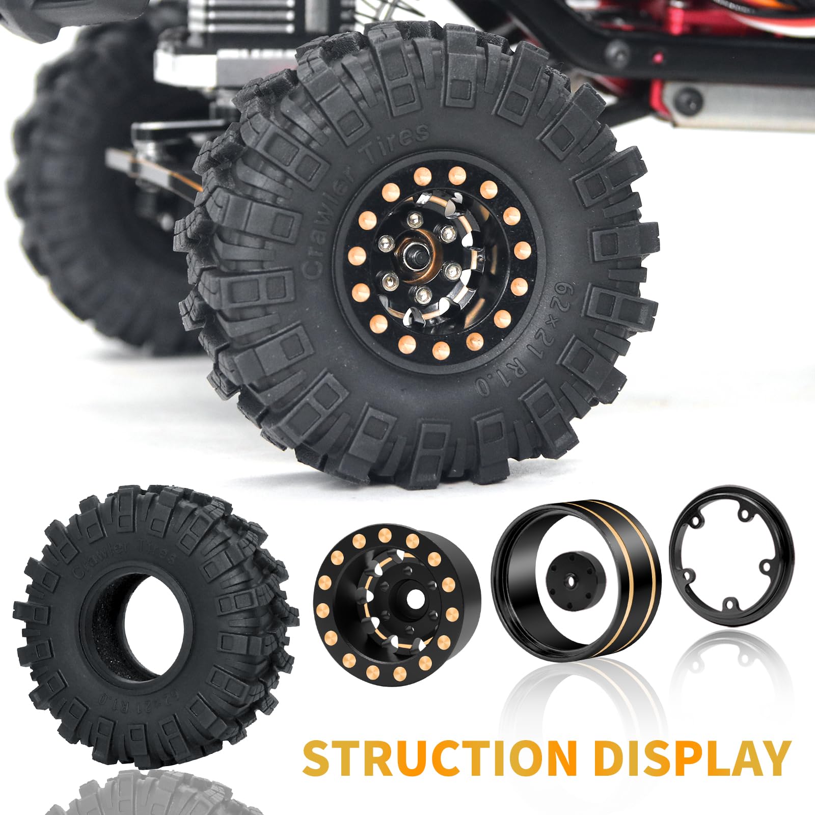 - Q: What are the specifications of the OGRC 1.0 RC Wheel and Tires? A: The OGRC 1.0 RC Wheel and Tires feature a negative offset of 7mm, are made from high-quality brass for the rims, and ultra-soft SS compound for the tires. The tire size is 62*21mm, and each wheel rim weighs 47g without the tires. This set includes 4 wheels and tires and is suitable for various RC vehicles such as the Traxxas TRX4M and Axial SCX24.