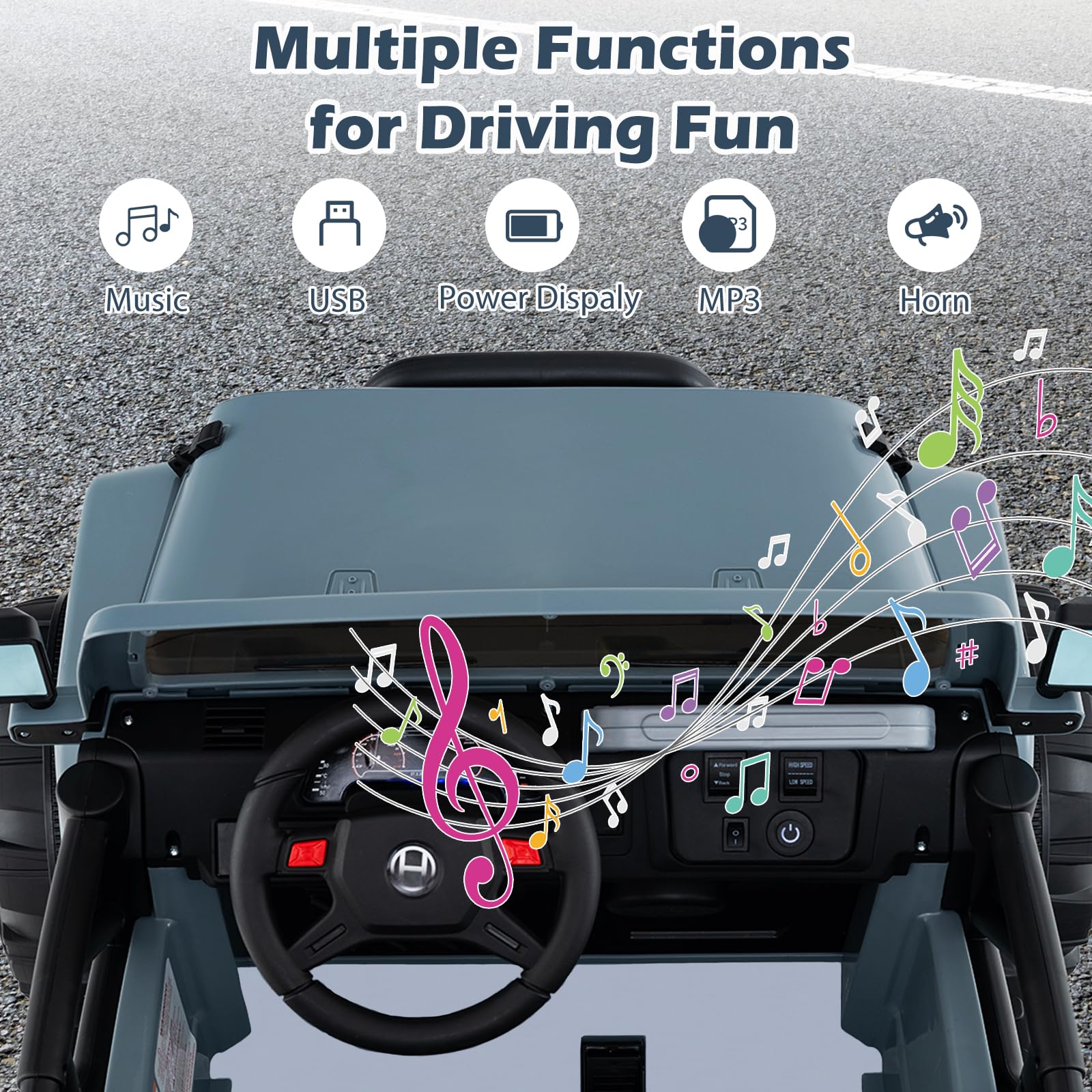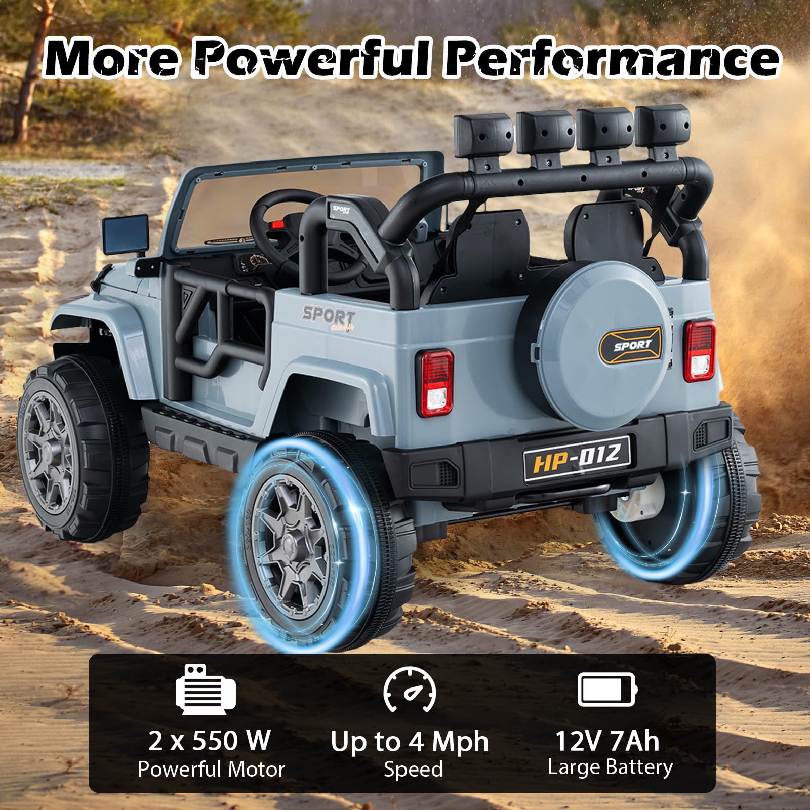 Why do you choose OLAKIDS 2 Seater Kids Ride on Car?OLAKIDS 12V Jeep Ride-On is designed with bright LED headlights, foot pedal and a rotating steering wheel, imitating the real experience of driving a Jeep truck. This 2-seater electric toy car is double fun for children and can be operated by both kid and parents. The child controls the steering wheel and pedal through the one-click start, and the use of parental remote control is another way (2 x 1.5V AAA batteries not include). The remote control toddler car features a smooth start function and a 2-point safety belt to ensure a safe playtime on almost any terrain. Story, USB, MP3, and built-in music offer more options according to kid's preferences. As a gift, this ride-on car brings even more joy to children.Features:12V 7AH batteries provide more powerful performance and longer battery life2 seat for children double the fun3 speeds can be adjusted by remote controlEquipped with music, radio, USB for more funSlow start avoid being frightened by sudden accelerationGive your child a perfect riding experience like a real car, fully experienceWear resistant wheels for riding on grass, wood, rubber tracks or brickIncludes a remote control for parental controlSuitable for children 3+ years oldSpecification:Color: Black, Pink, White, Gray , RedNet Weight: 46.7LbsMaterial: PP, IronMaximum load: 110 LbsCharge Time: 8-12 HoursPlaying Time: 50-80 MinutesMotor: 2 x 550WBattery: 12V 7AHSpeed: 2.5-4 MphSuitable Age: 3+ Years OldDimension of Seat: 19 x 7.5 x 11.5 (L x W x H)Overall Dimension: 49 x 31 x 30.5 (L x W x H)Package includes:1 x Remote Control1 x Charger1 x Instruction