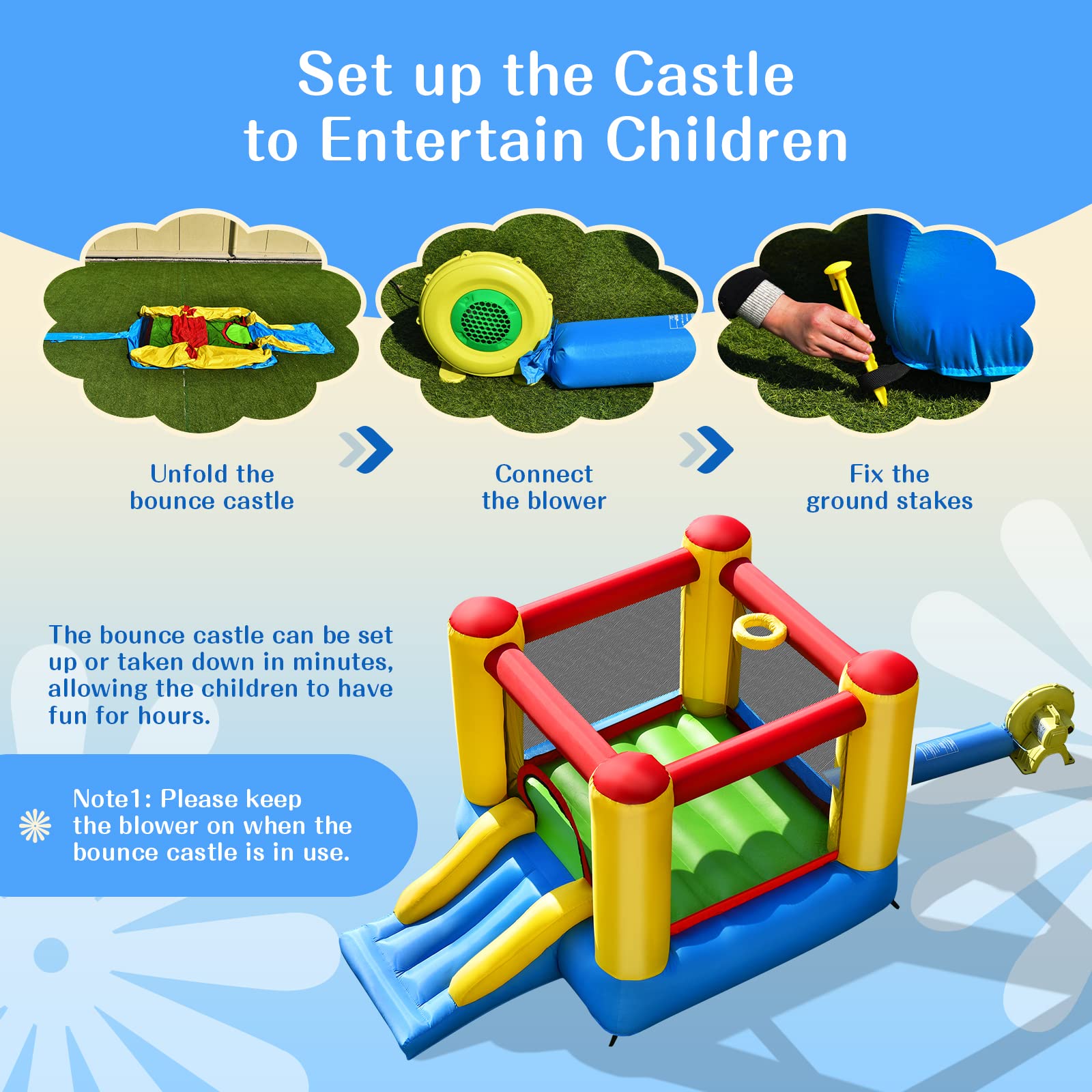 Inflatable Bouncing Castle: OLAKIDS inflatable bouncer is designed with large bouncing area, a slide and a small basketball rim to satisfy different requirement. It is suitable for 2 kids from 3 to 5 years old to play together, who are weight under 75 lbs each. | Enjoy Unlimited Fun: With attractive castle design, kids will enjoy the endless hours of happiness with their families and friends at this bouncing house, which is beneficial to inspire their interest in sports and reduce screen time. It is a good opportunities for children to exercise and build friendship. | Quality Materials for Safety: This jumping castle is made of puncture-resistant 420D and PVC-coated Oxford materials, which is durable for longer life span. The main bouncing area is surrounded by mesh walls, which can ensure the safety and the maximum ventilation while children are playing. | Effortless Assembly: This outdoor inflatable bouncy blows up in minutes with 480W blower and it needs to be continuously inflated when used. Easily setting up and taking down, this bouncing castle can be used at yard, park, lawn, etc. | Free Accessories: This bouncing castle comes with a carrying bag for storage and convenient movement, a repair kit to fix and keep using. 4 ground stakes are also provided for stability and firmness of the entire castle bouncer. It is an ideal present for your kids. | US. CPSIA & ASTM Approved: Made of non-toxic material without any odor, Free from BPA, PVC, Phthalates, Lead, Latex, and Formaldehyde. No sharp points or edge. Passed the tests of stability, asphyxiation, load and shear.