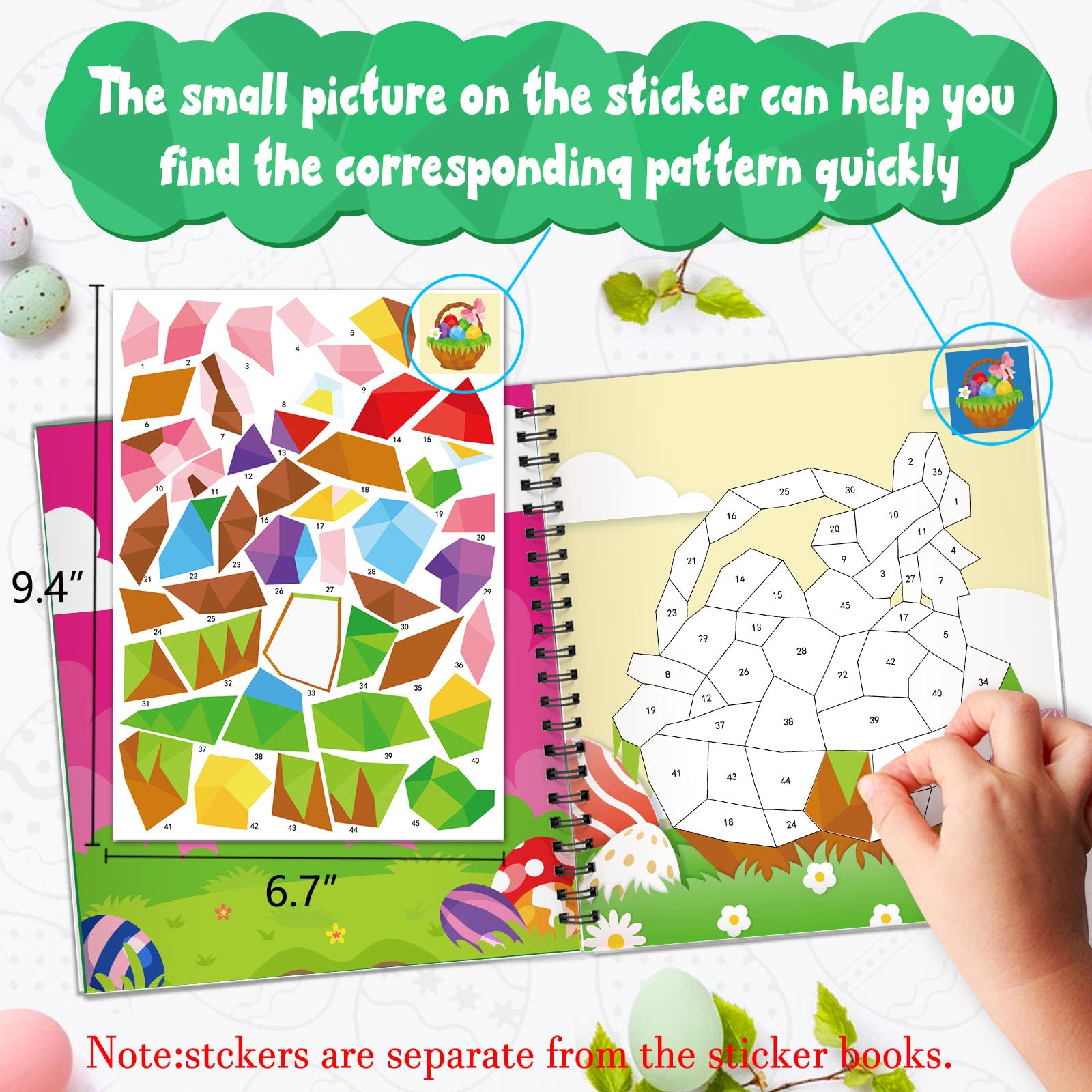 - Q: How does the sticker paint book work? A: Each sticker paint book includes perforated pages with designs that are divided into spaces. Kids can match numbered stickers to the corresponding spaces, allowing them to create colorful pictures without using paint.