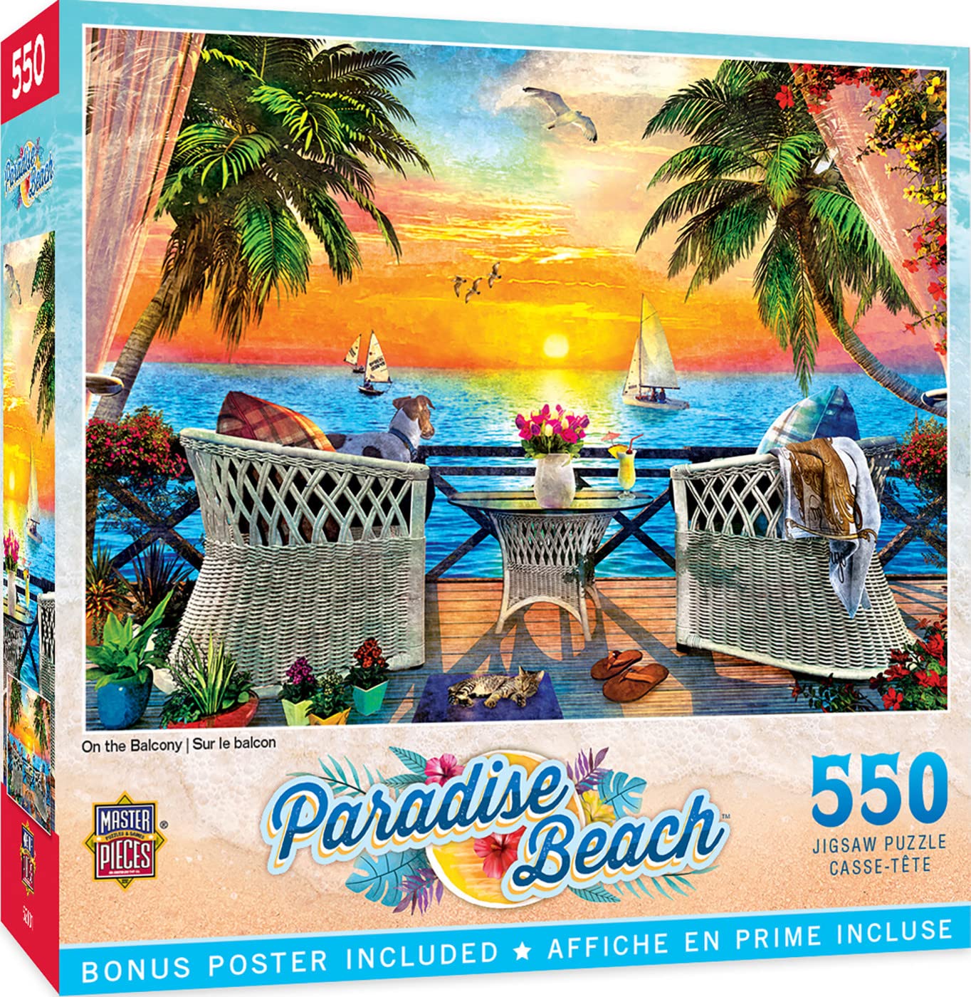 These MasterPieces 24'' x 18'' 550PC puzzle.Enjoy the view from a balcony overlooking pristine blue waters as the sun sets in colorful stripes across the evening sky. Sip on a tropical drink and take in the sea breeze in this relaxing scene.. To reduce their impact on our environment, the chipboard used in these puzzles is made of recycled material.
