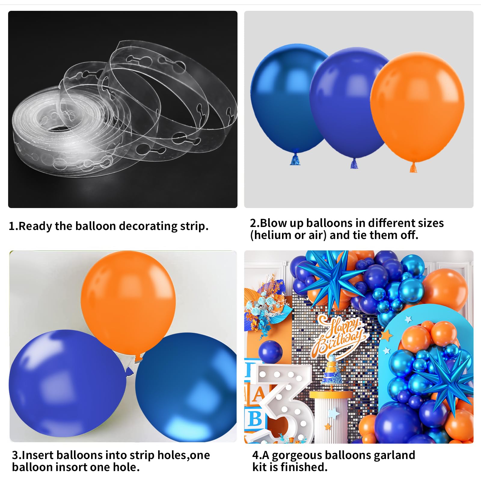 ??? Orange Blue Balloon Arch?Our Orange And Blue Balloon Garland Kit Contains:2 X 18Inch Balloons (Orange*1,Royal Blue*1) , 50 X 10Inch Balloons(Roya Blue*20,Worange*20,Metallic Blue*10), 50 X 5Inch Balloons (Roya Blue*20,Worange*20,Metallic Blue*10), 2Pcs Explosion Star Balloons,Balloons Strip 1Pc, Adhesive Tape 4Pcs,Ribbon 1Pc. | ???Premium Material? Our Royal Blue And Orange Balloons Are Made Of Natural Latex.Each Of These Latex Balloons Is In A Brighter Color And Brighter Thicker Than Normal Latex Balloons.Safe To Be Used For Children.Blue Orange White Balloons Arch Kit Will Be Your Perfect Party Decorations. | ???Wide Application?This Classic Blue And Orange Party Decorations Kit Have Been Suitable For Such As War Parties, Birthday Parties, Baby Showers, Celebrations, Friend Gathering Parties, Weddings, Stage Performances, Carnival, Dance Parties, Colorful Balloon Bouquets, Creating,Leaving An Impressive And Unforgettable Party For Your Guests. | ???Easy To Use?The Orange Blue Arch Is Very Easy To Assemble, Just Inflate The Balloons, Then Stuff The Knot Into The Hole Of The Balloon Arch Chain. You Can Hang Them On Trees, Walls, Windows, Doorways, Dining Tables And Anywhere You Like. It Will Be A Funny Family Craft To Diy With Your Family! Hope You Enjoy The Fun Of Diy. | ??? Buy With Confidence?We Are Very Confident Our Product Is Created With Quality Manufacturing With Top Materials. If You Are Not Satisfied With The Colors, Quality, Or Anything,We Promise We Will Provide You With A Satisfied Solution.