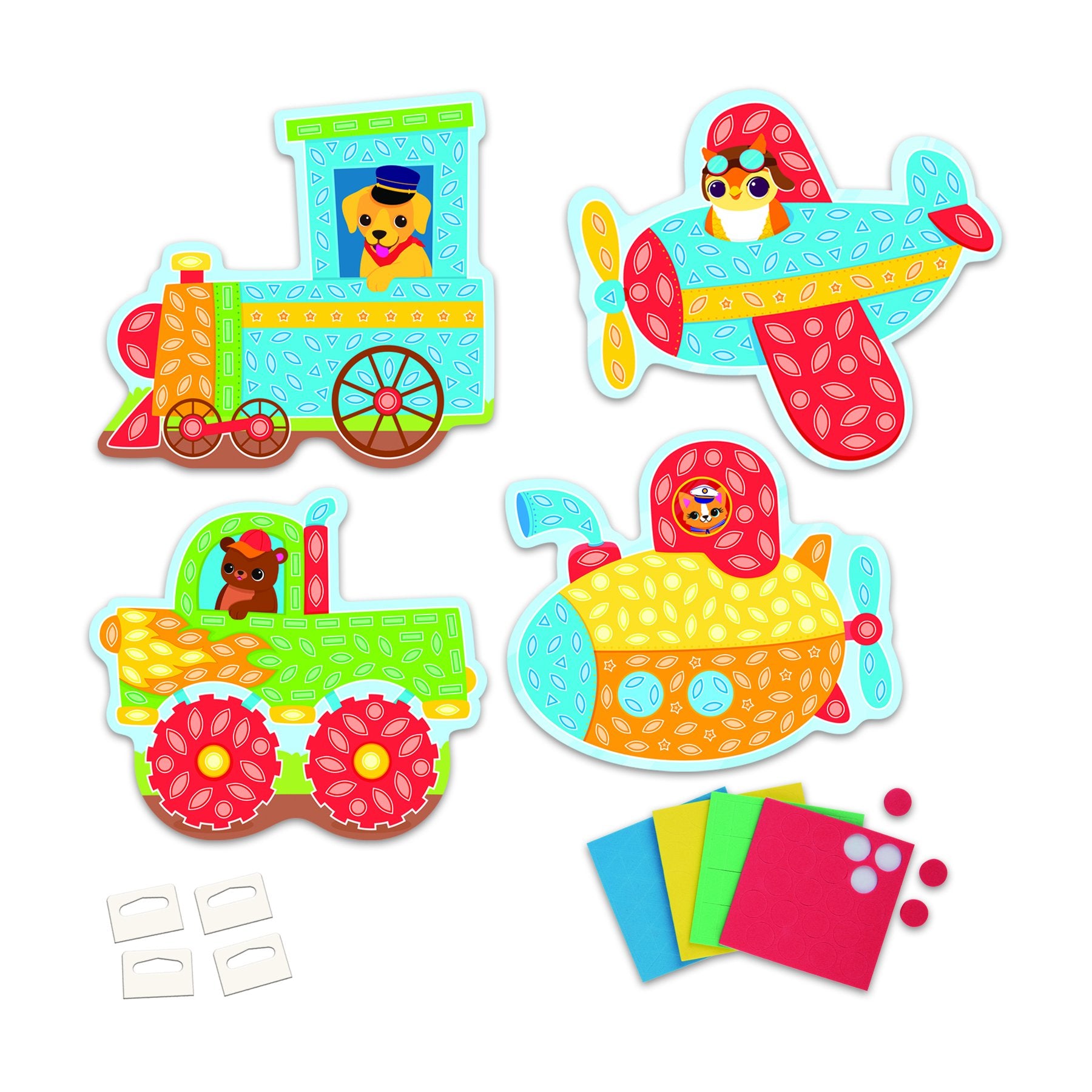 Product DescriptionPerfect for little crafters with big imaginations, My First Sticky Mosaics Vehicles is an extra-fun activity kit with special, oversized pieces. Kids discover, learn and create by matching colors and shapes on a numbered template. Its simple, convenient, mess-free play.Set Contains:4 sheets with vehicle patterns; several sheets of coloured self-adhesive foam