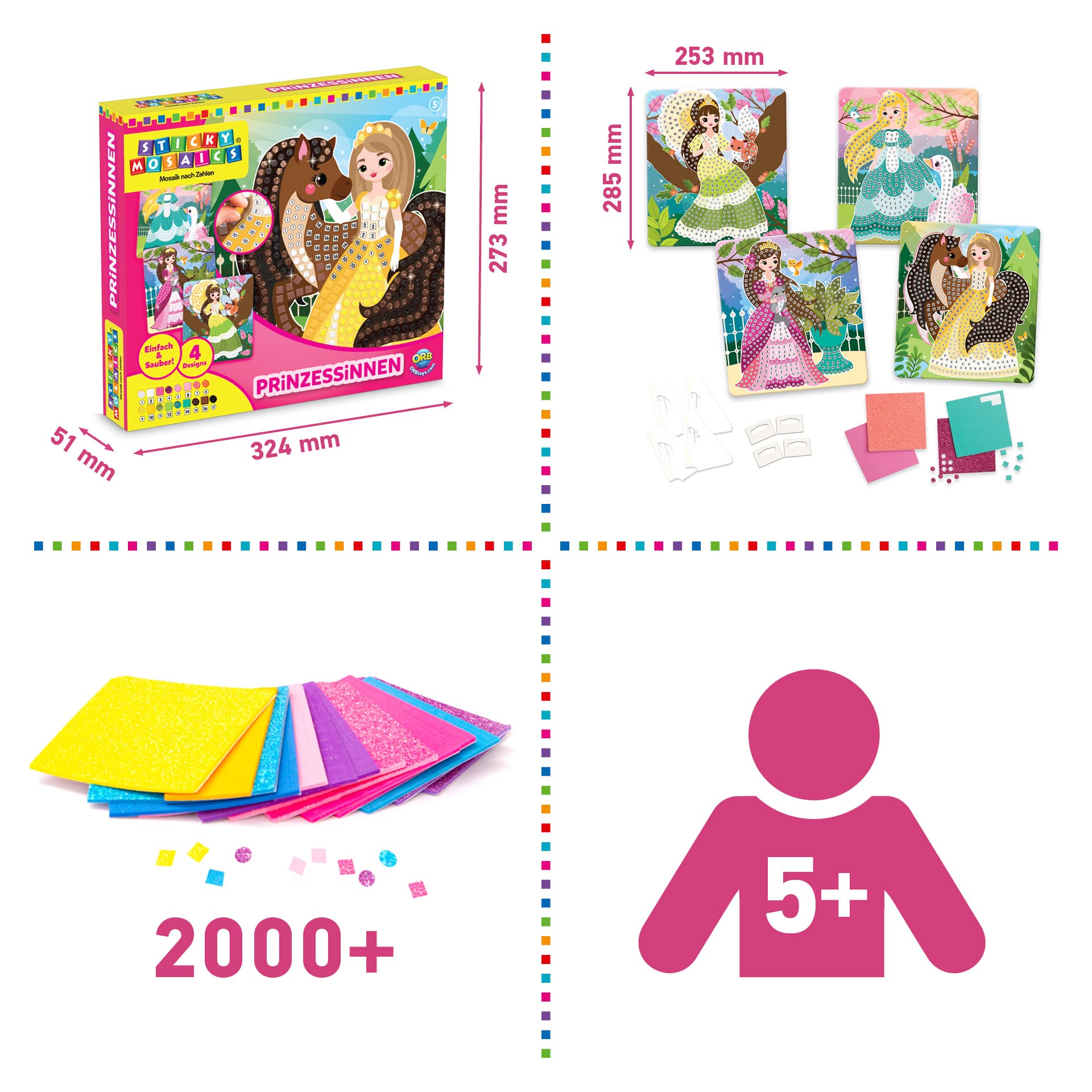 Make a masterpiece with Sticky Mosaics Princesses! This colorful craft kit is super fun, simple to use, and perfect for at-home or on-the-go entertainment. Its easy to get great results every time-just peel the tile, stick it on the template and watch the mosaic come to life. There are 4 designs to complete per box.