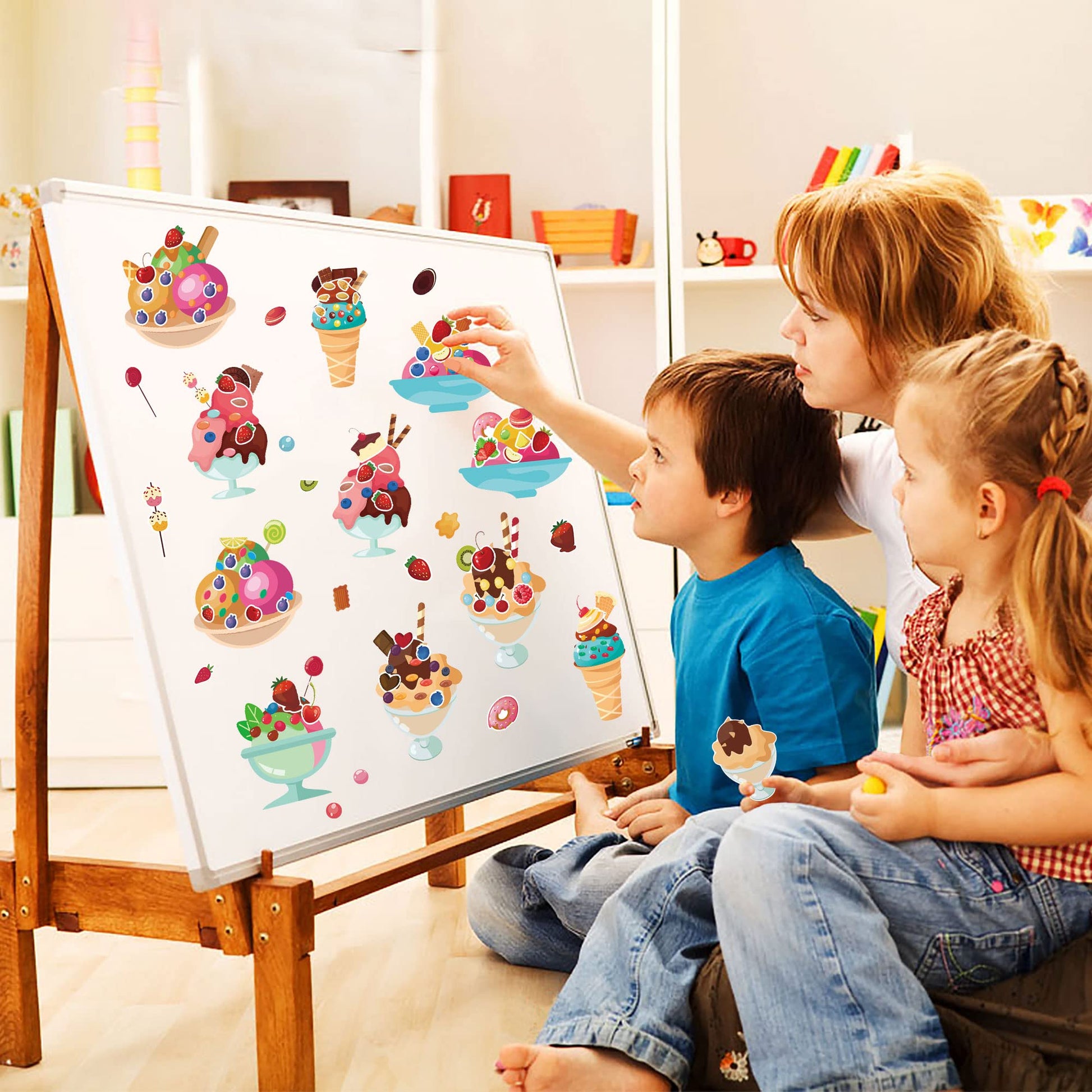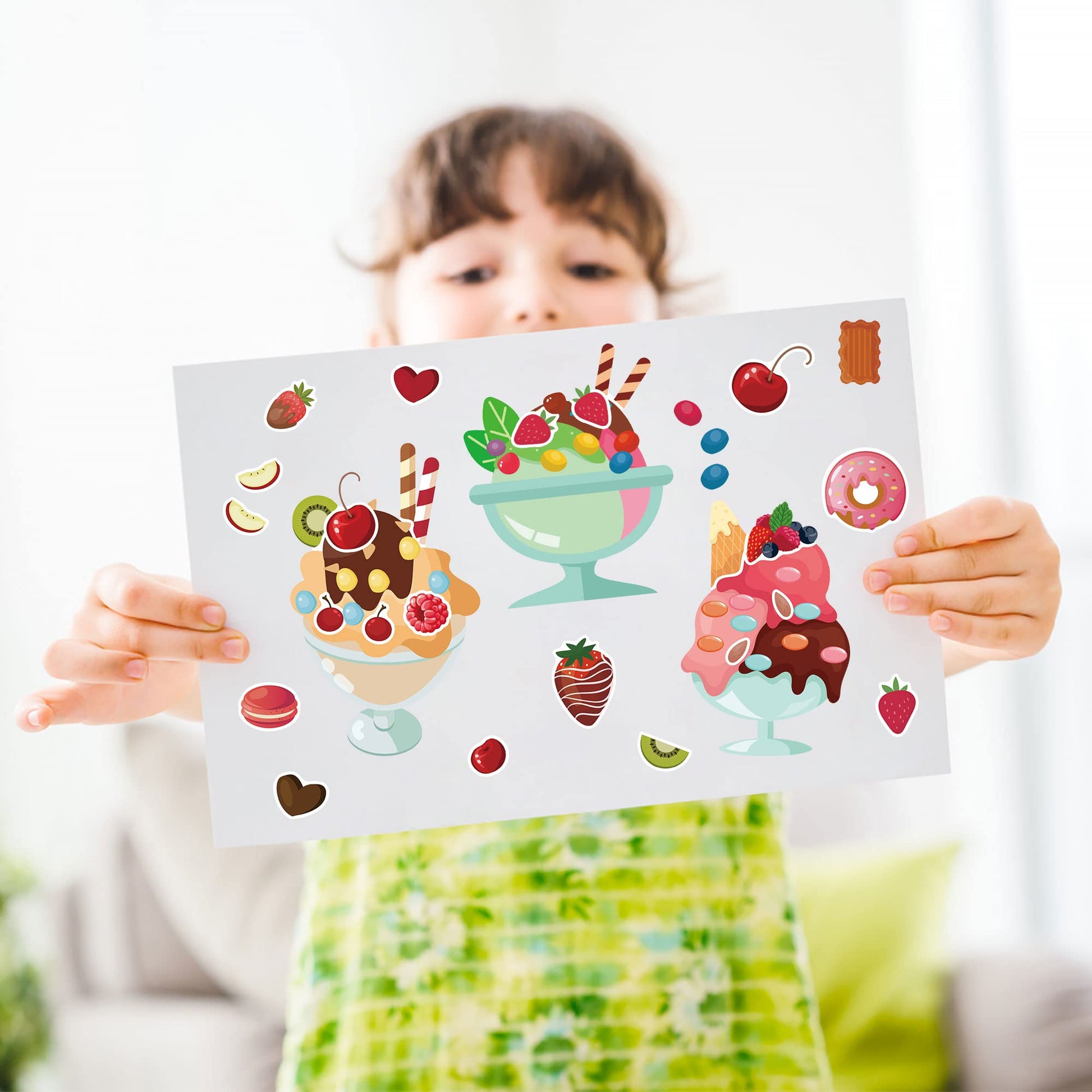 - Q: What types of designs are included in the sticker pack? A: The sticker pack includes 24 sheets featuring 6 different designs, with 4 sheets of each design. Each design showcases unique ice cream characters and various accessories that children can mix and match.