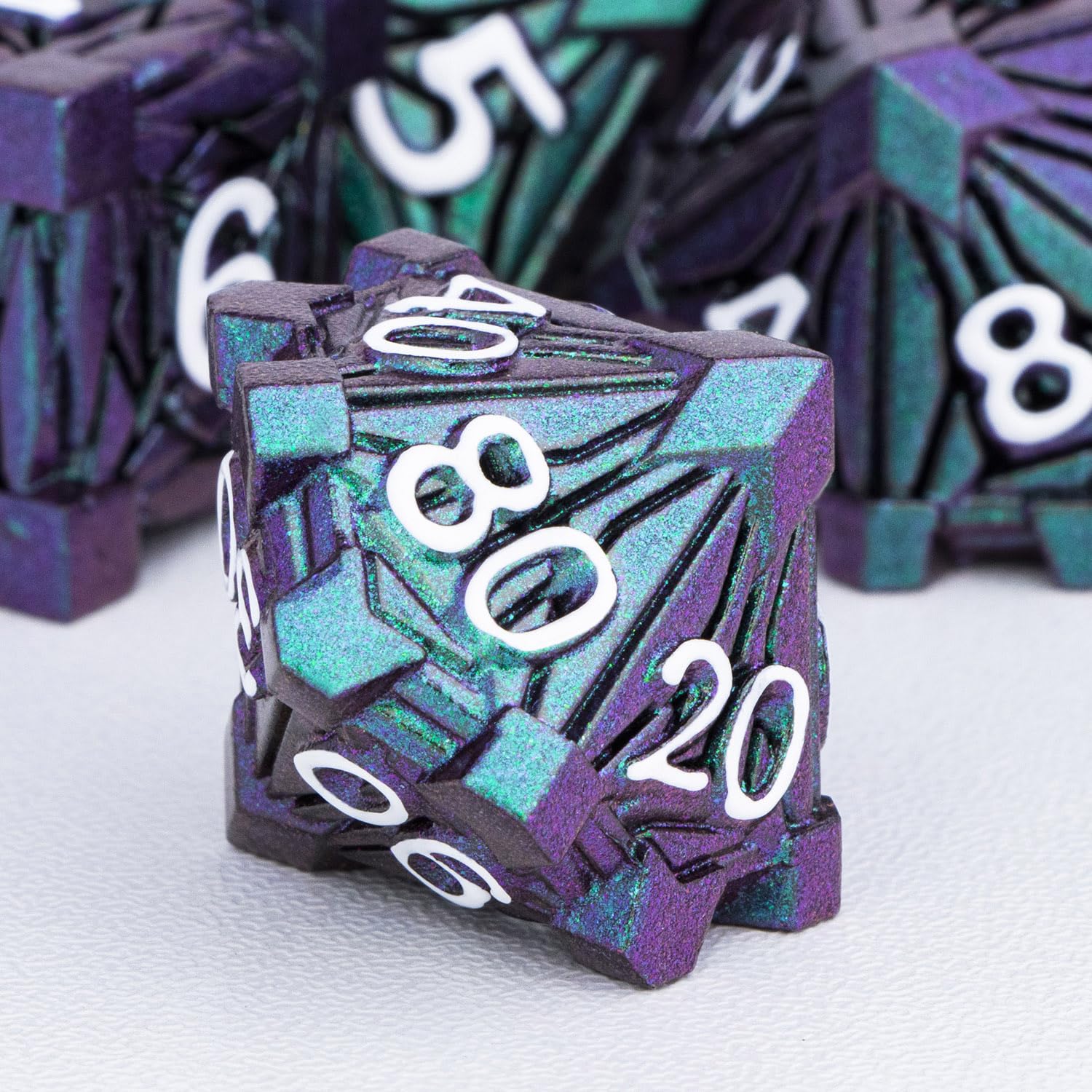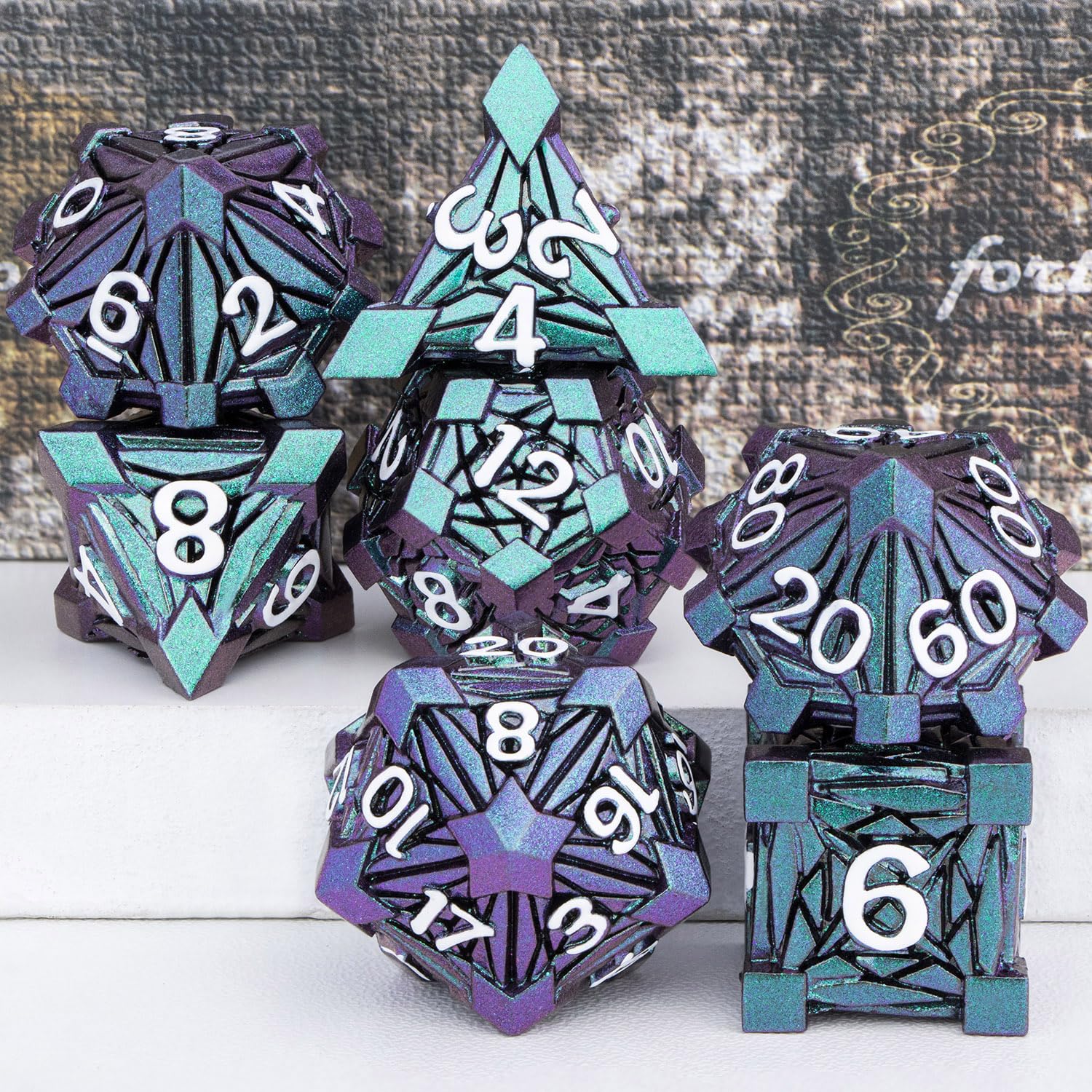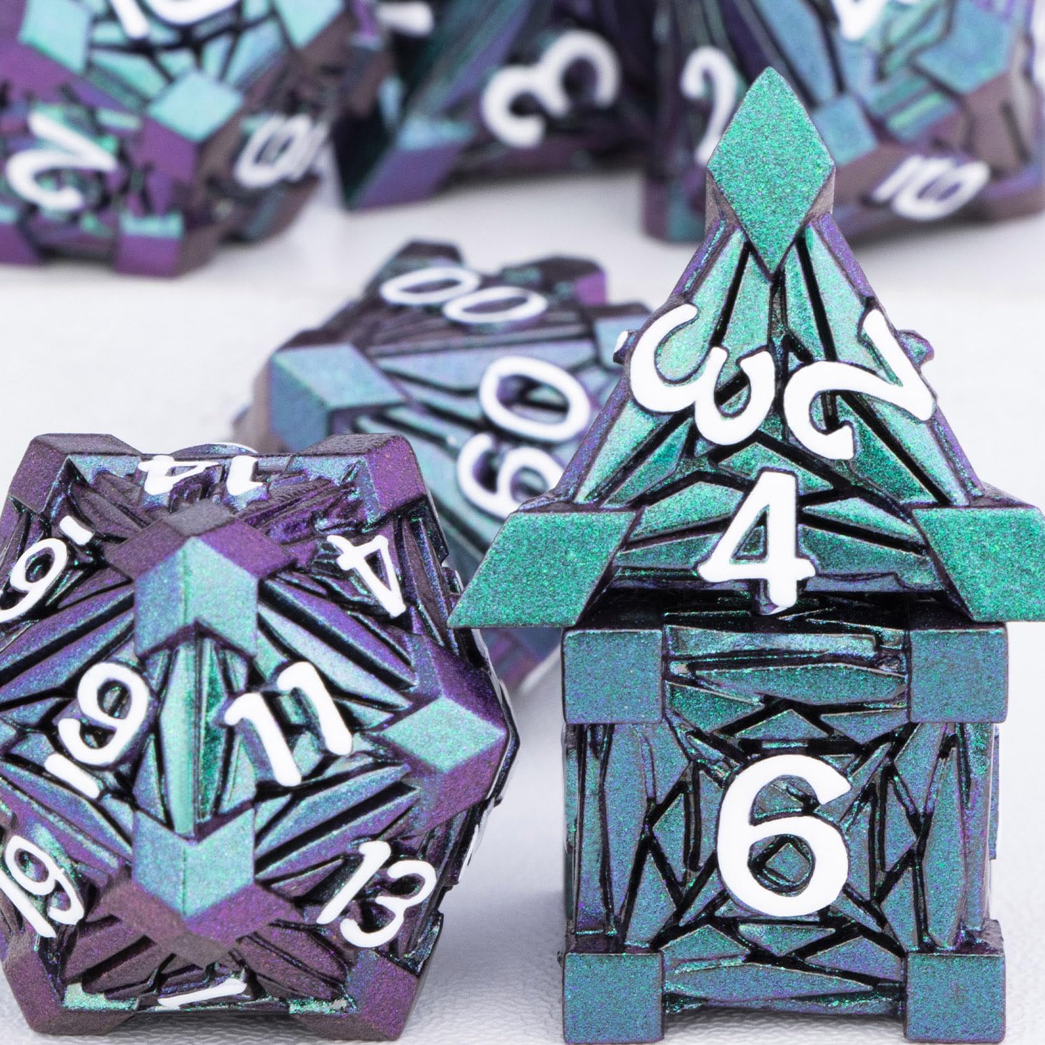 View compareORIFANTOU 7PCS Metal DND Dice Set with Box, Debris RPG Green Purple D and D Dice for use with D&D Tabletop Games Role Playing Ga