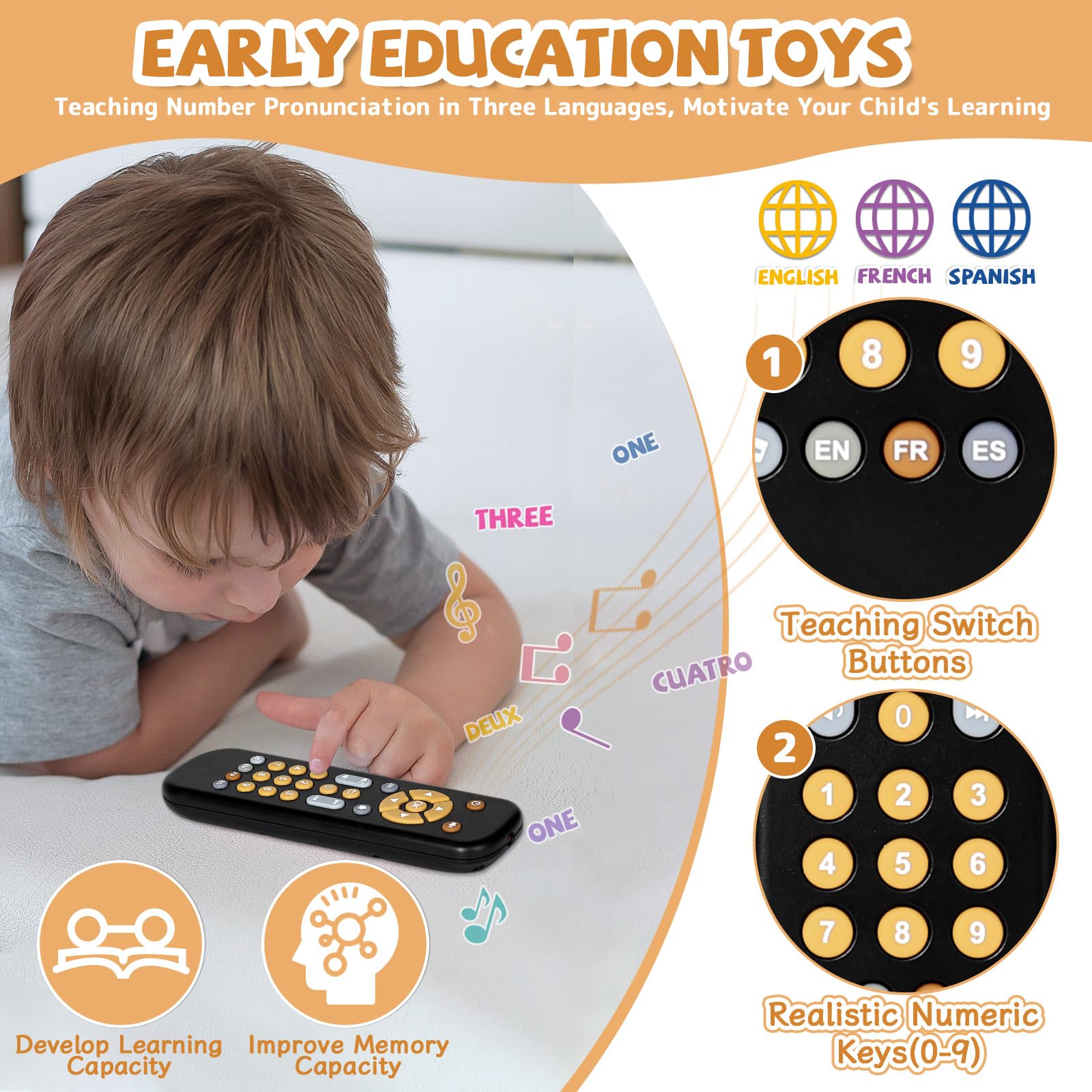 - Q: What languages does the Orzbow Baby Remote Control Toy support? A: This toy features voice teaching in three languages: English, French, and Spanish, which helps engage your baby's language acquisition.