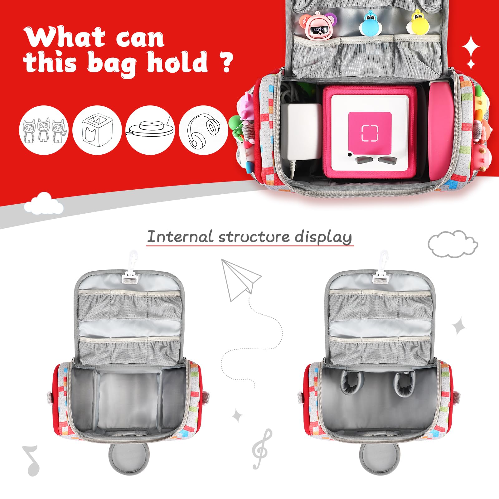 ?Large Capacity?The Toniebox bag can be stored independently in the middle of the box, and the other two large spaces can be used to store headphones, chargers or figures.
