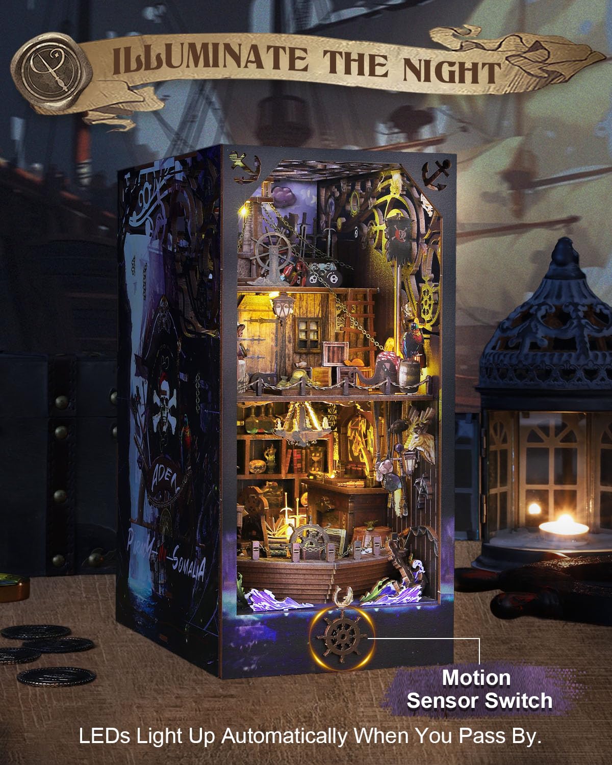 OurMiao Book Nook Kit Pirate Ship Aden, DIY Miniature Book Nook Kits for Adults, 3D Wooden Puzzle Bookshelf Insert Decor with Se
