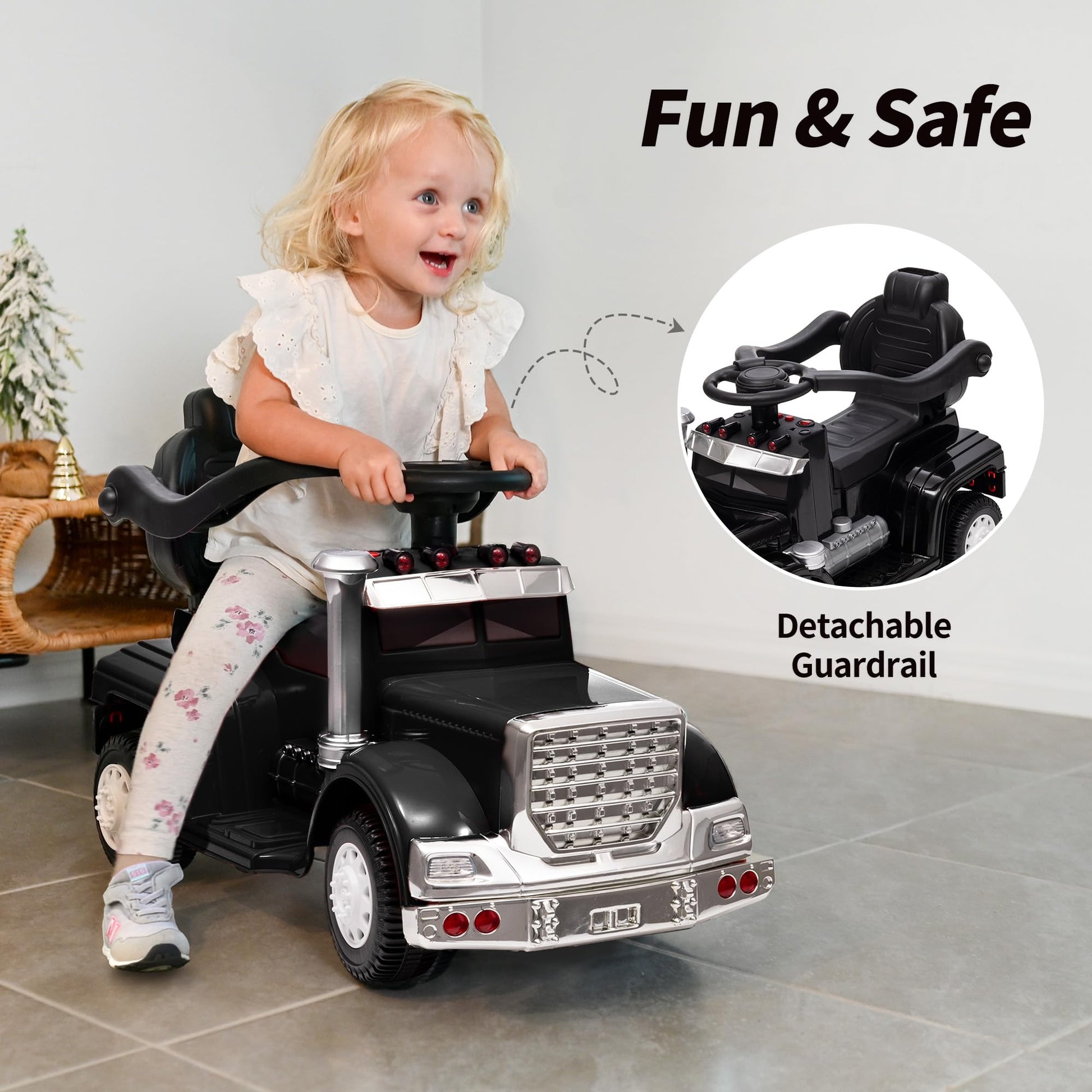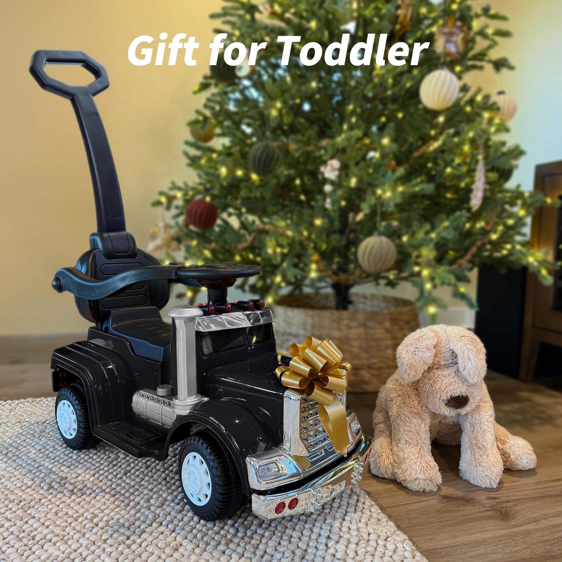 This 3-in-1 toddler push ride-on car is designed to grow with your child, offering a combination of a stroller, a walking car, and a ride-on toy. Suitable for toddlers and with a maximum capacity of 55 lbs, this ride-on car is safe and fun for your little one. It comes equipped with lights and a music player to make playtime more exciting (cell batteries required but not included). Certified for safety, parents can rest assured knowing their child is secure while enjoying the versatility of this ride-on. Whether theyre sliding on their own or being pushed by a parent, this ride-on car provides hours of entertainment and practical use.
