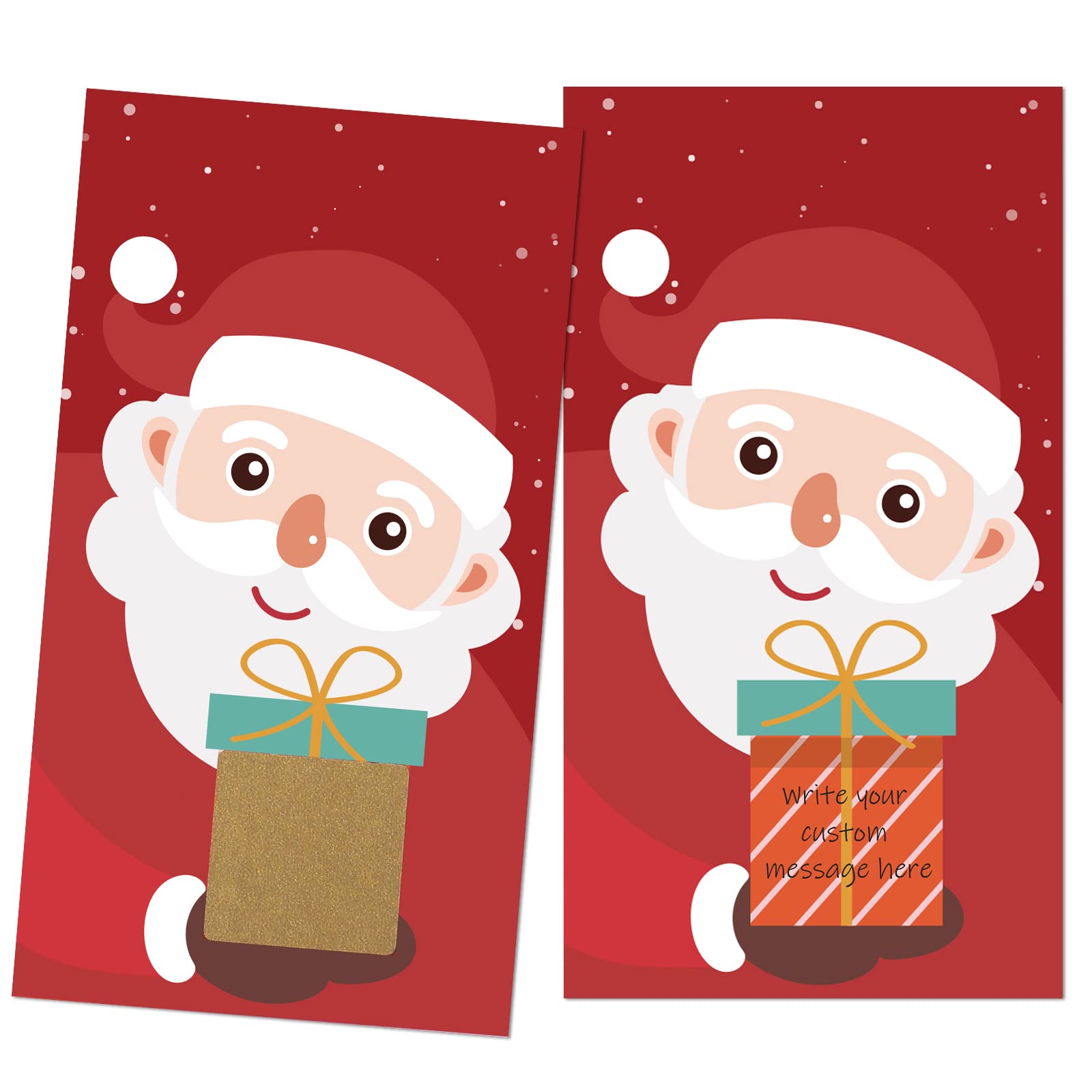 These scratch off cards are printed with two results, you can set how many winners and losers, and then paste the scratch off stickers. Just scrape off the gold layer with your finger, and you will know the result. You can write a personal note or Christmas wishes in the back of this card.