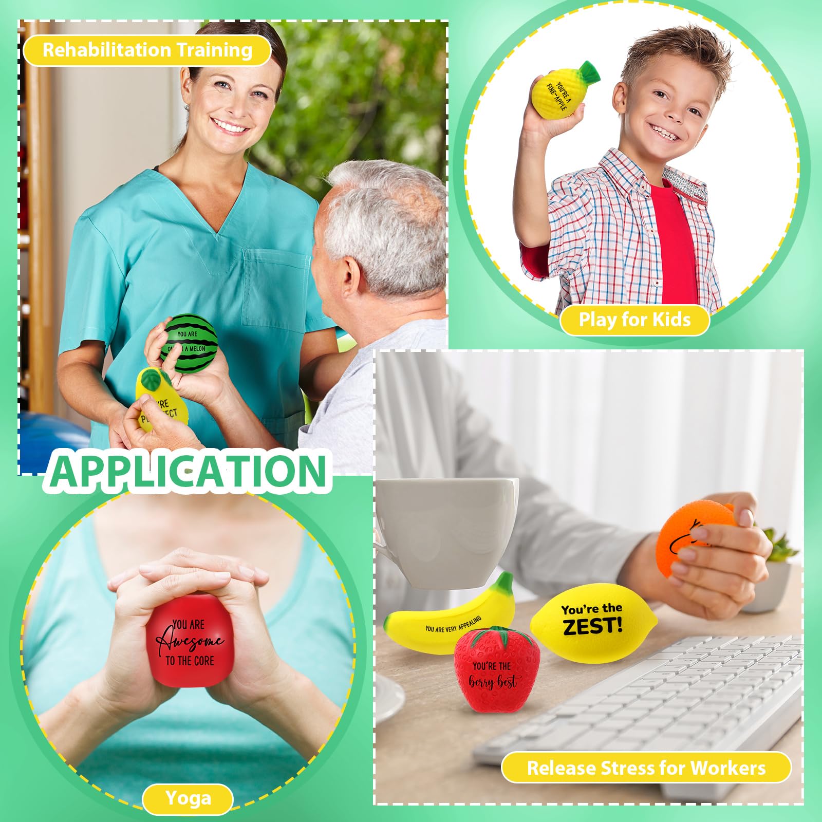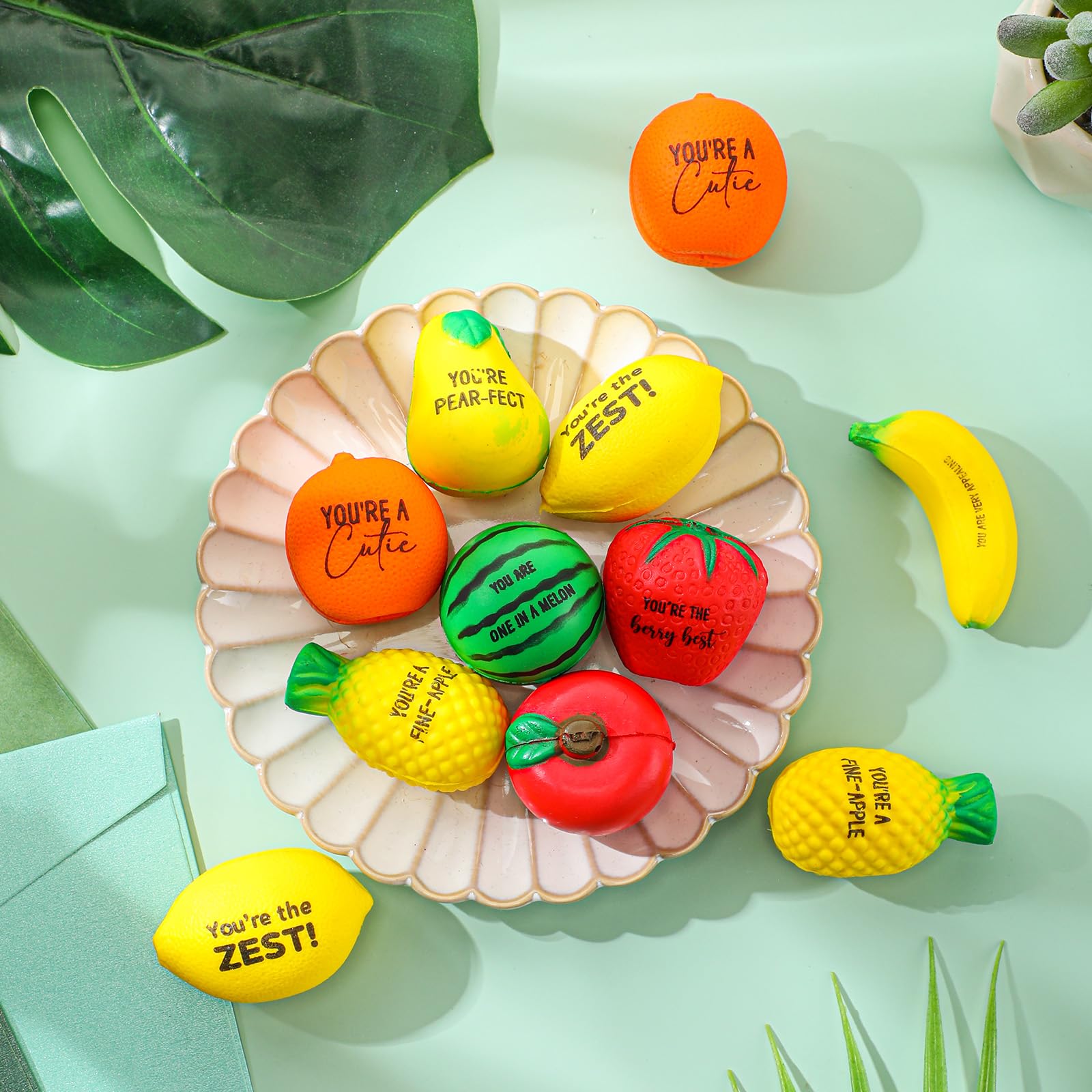 • Q: What makes these fruit stress balls a good gift option? A: Each fruit stress ball features an inspiring sentence, making them not only fun to use but also a thoughtful gift for coworkers, employees, or anyone needing a motivational boost.
