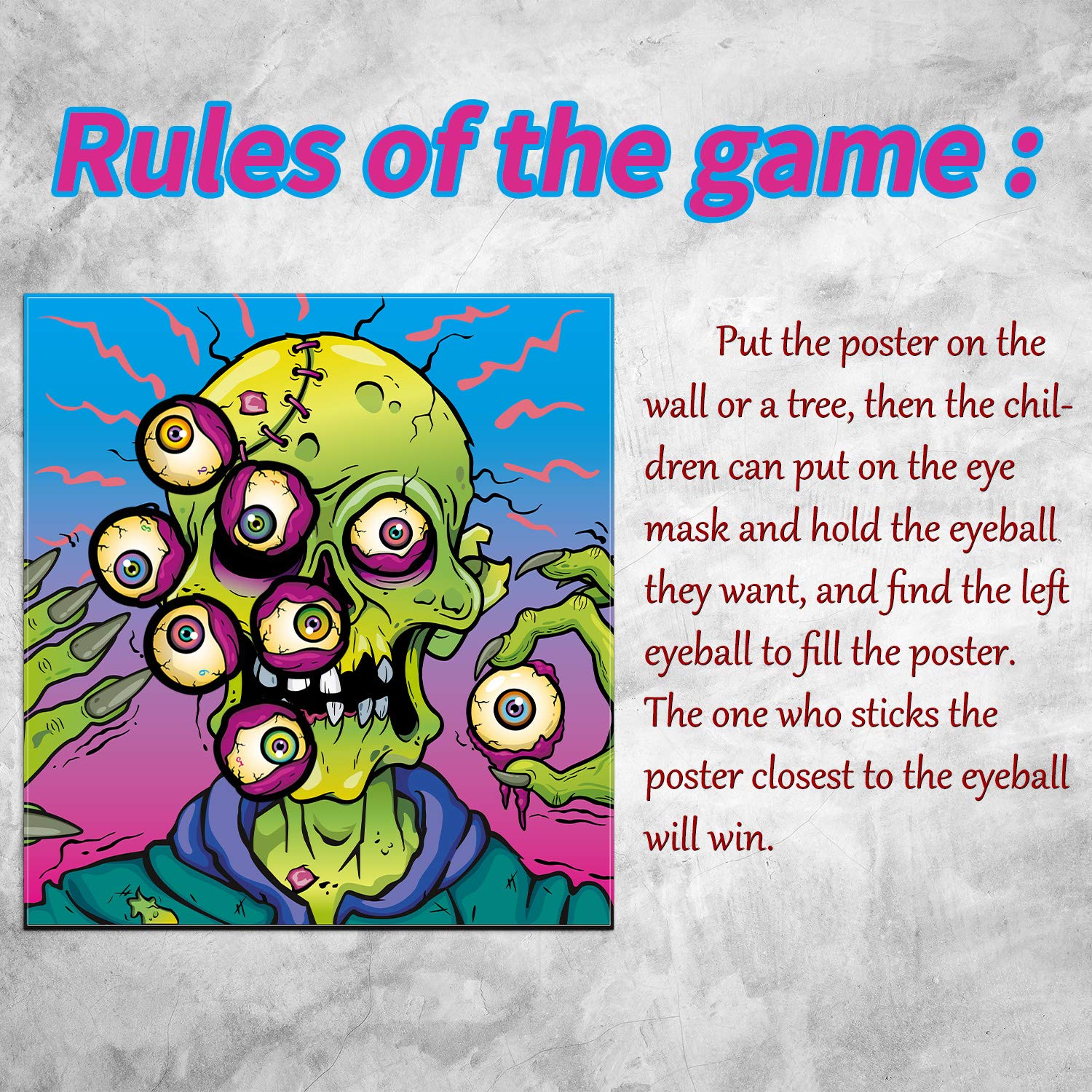 Zombie game poster features with 24 pieces zombie eyeballs and 6 pieces black eye mask, pin the eyeball on the zombie game